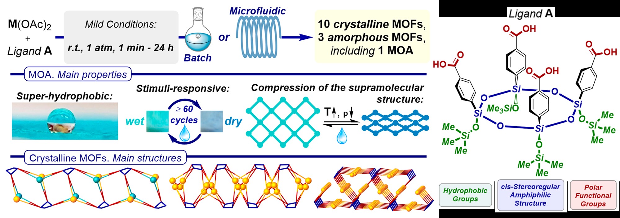Эта молекула интересна тем, что в ее основе лежит кольцо из кремния и кислорода, с одной стороны от которого расположены четыре кислотные группы, а с другой — четыре кремнийорганические группы с водоотталкивающими свойствами. Это позволяет формировать связи с ионами металлов, необходимые для построения металл-органических каркасов, и придавать полученным соединениям водоотталкивающие свойства.