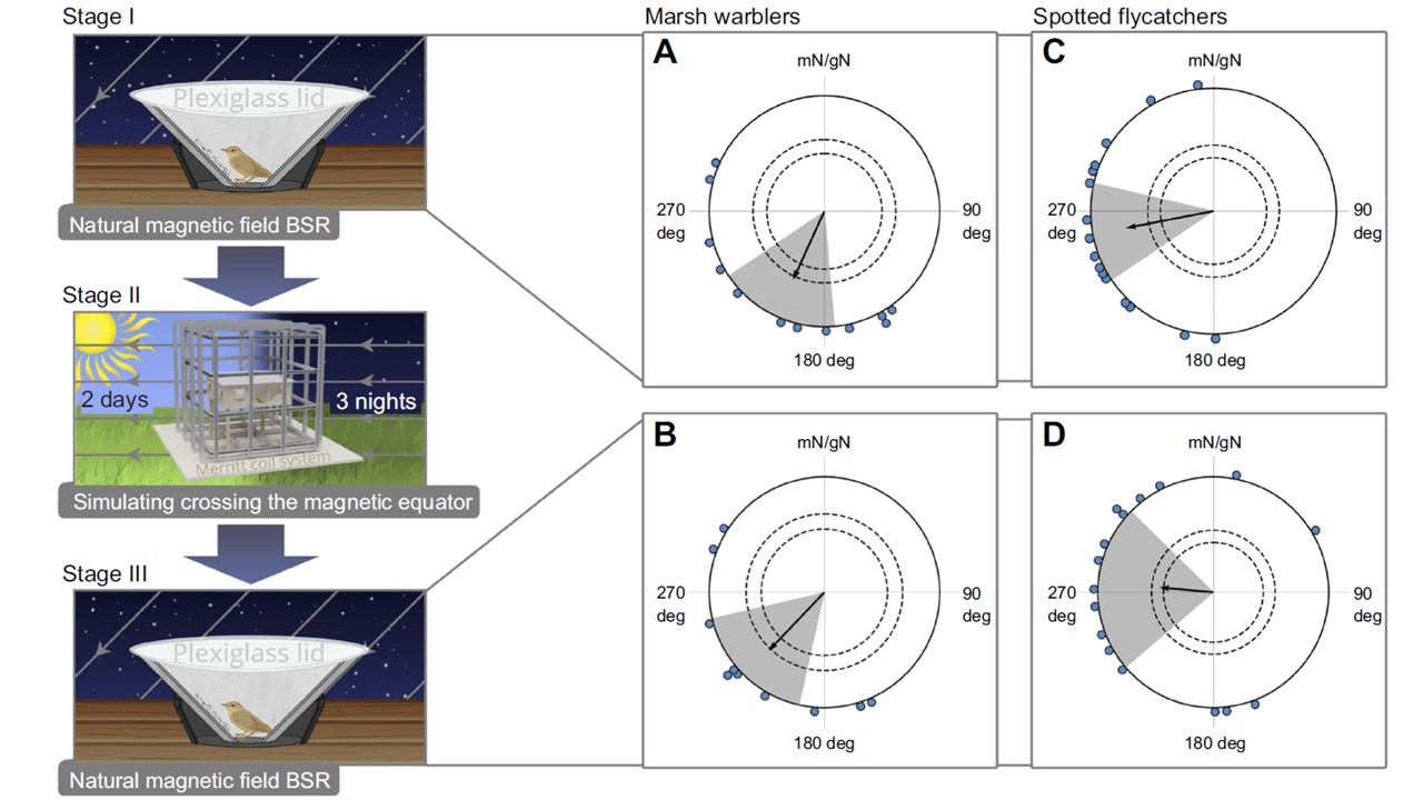 Биологи поместили в такой ориентационно «слепой участок» на два дня и три ночи молодых (еще не совершавших перелетов) болотных камышевок (Acrocephalus palustris) и серых мухоловок (Muscicapa striata). Эти виды выбрали потому, что они регулярно пересекают магнитный экватор во время миграции из Европы в Африку. При этом птицы не имели возможности получать какие-то другие сигналы, помимо геомагнитных, для ориентирования — например, видеть расположение звезд или оценить длину светового дня. После того как их подержали в условиях магнитного экватора, авторы проверили направление их ориентации в круговых аренах — небольших клетках в форме конуса.