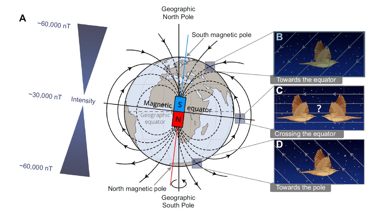 Когда летящая на юг птица пересекает магнитный экватор (здесь магнитное поле Земли становится горизонтальным, поскольку вертикальная составляющая поля равна нулю), ей нужно переключиться от полета к экватору на полет к полюсу. В реальных условиях это Южный полюс, и она дальше летит на юг. Географически магнитный экватор проходит близко к обычному, но отклоняется в некоторых регионах. Например, в Южной Америке он смещен к северу, а в Индийском океане — к югу.