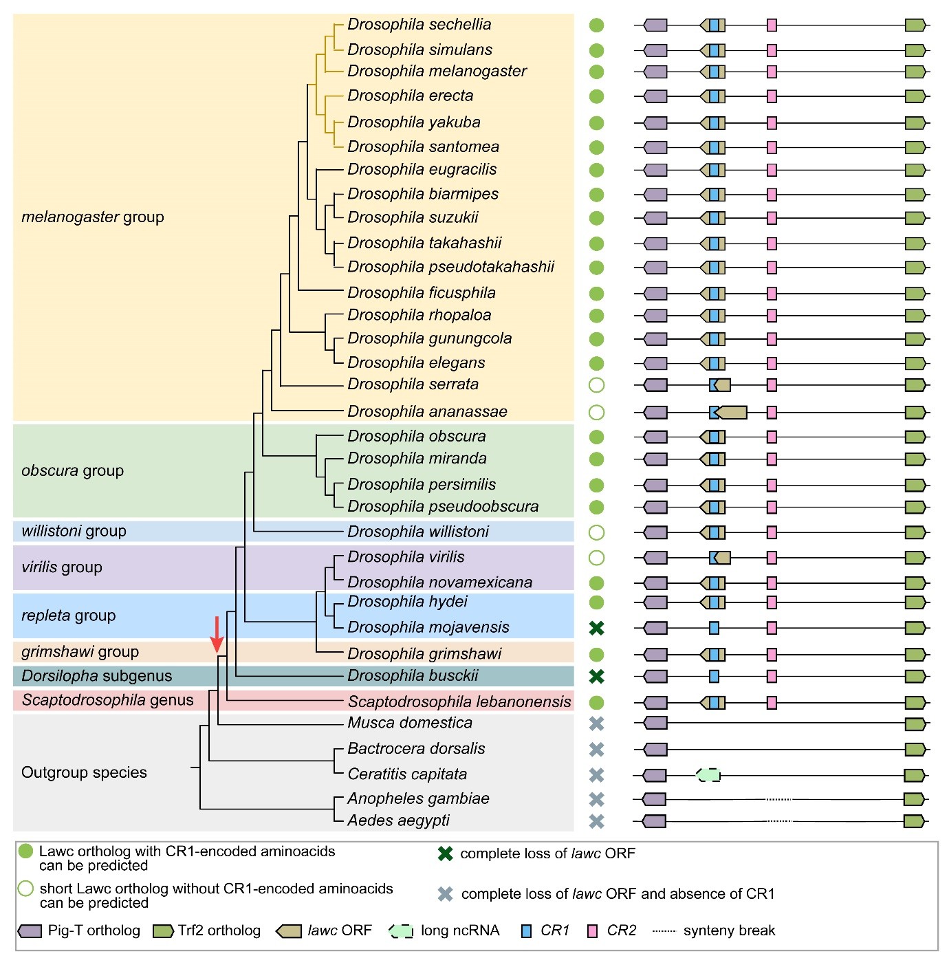 Эволюционная история гена lawc. Консервативные элементы CR1/CR2 выделены голубым и розовым цветом. Красная стрелка указывает на время появления предка гена lawc (68 миллионов лет назад), что совпадает с появлением элементов CR1/CR2. Справа схематически изображен район локуса Pig-T~Trf2, предсказанный у различных видов двукрылых. Источник: Ольга Симонова