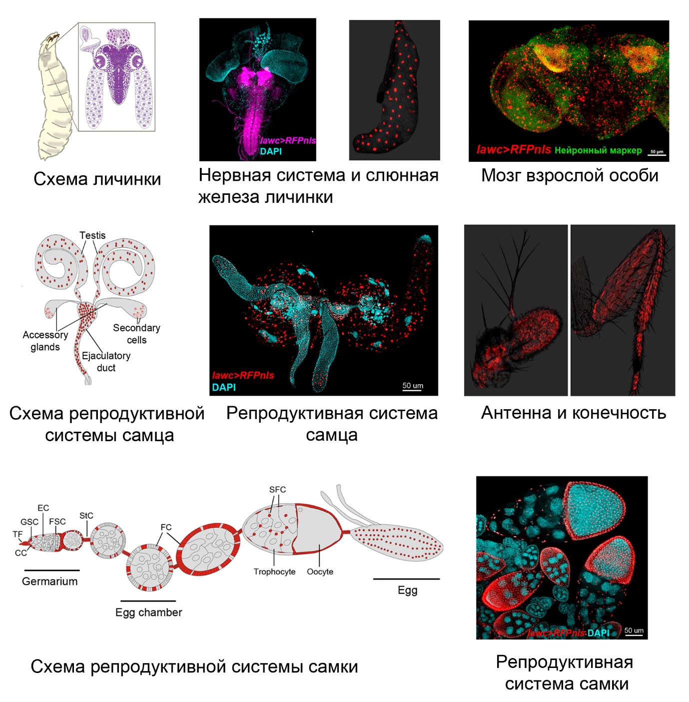 Активность гена lawc (красный цвет) в тканях личинок и взрослых дрозофил. Источник: Ольга Симонова