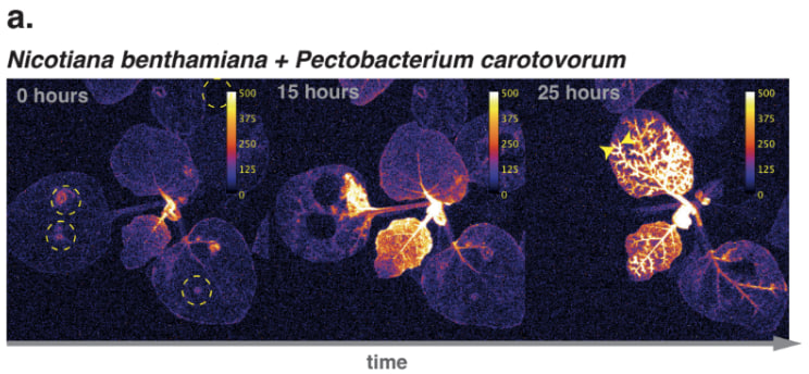 Сотрудники ИБХ РАН из лабораторий Александра Мишина, Татьяны Митюшкиной и Ильи Ямпольского в международной коллаборации представили систему, которая позволяет неинвазивно отслеживать в живых растениях активность двух ключевых защитных сигнальных путей — салициловой и жасмоновой кислот. Авторы создали линии растений, экспрессирующие автолюминесцентные репортеры, благодаря которым растение излучает свет только в то время и в тех тканях, в которых активированы механизмы защиты от патогенов и вредителей.