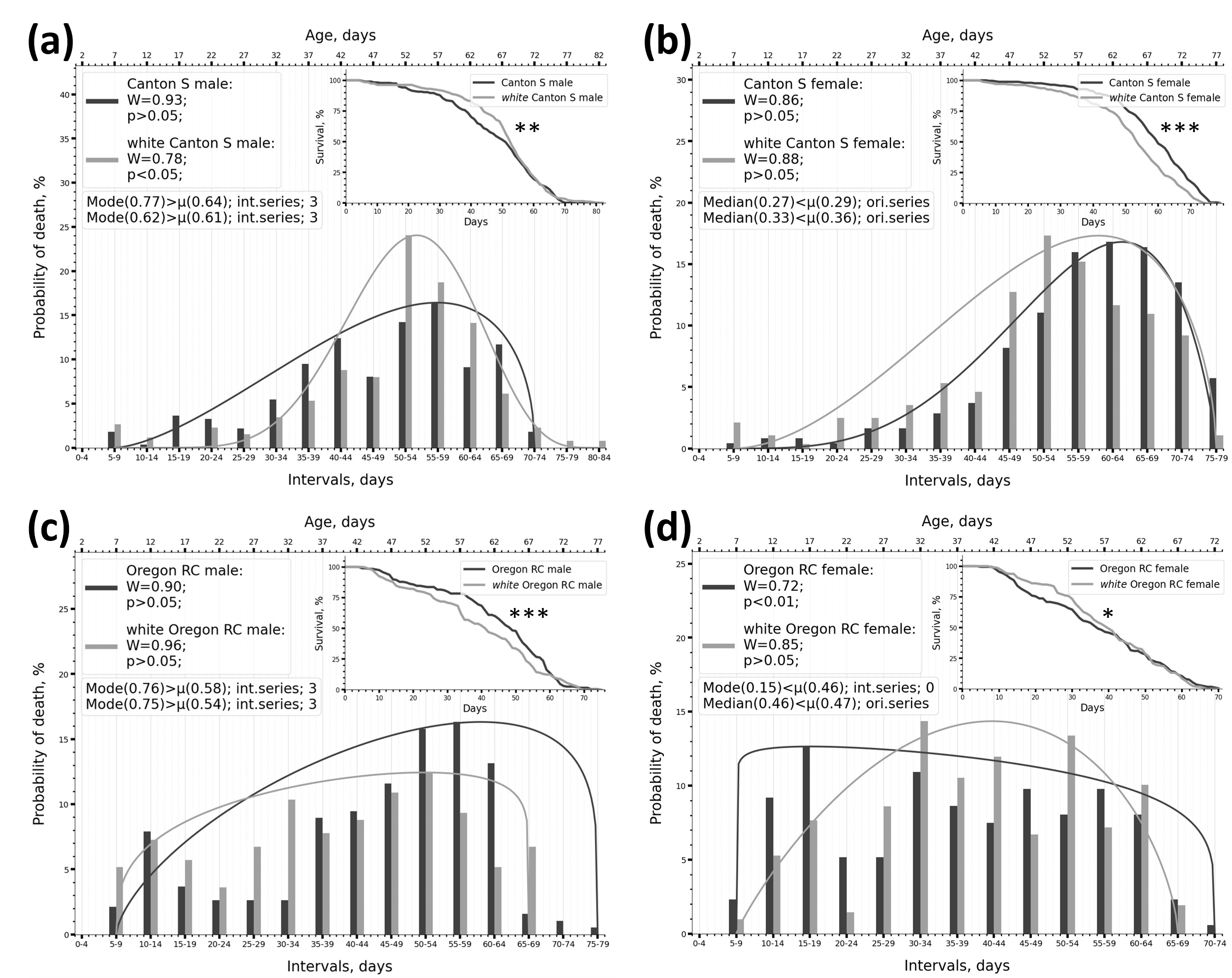 Для визуализации распределений продолжительности жизни и удобного сравнения выборок между собой исследователи предложили накладывать на частотные распределения функцию нормального распределения или же функцию бета-распределения. Последняя точнее и разнообразнее описывает форму частотного ряда и вдобавок более проста в применении, в отличие от способов с использованием критериев асимметрии и эксцесса, тогда как нормальное распределение более унифицировано (имеет одинаковую форму для обоих сравниваемых выборок). При помощи бета-функции было показано, что распределения продолжительности жизни у дрозофилы могут быть нескольких типов: лево- и правостороннее бета-распределение, симметричное колоколоподобное распределение, схожее с нормальным, и платообразное (равномерное/линейное) распределение. Исследователи обнаружили, что форма распределения менялась в зависимости от генотипа и пола выборки. При генетических интервенциях наблюдались переходы одного типа распределения в другой, вызванные или уменьшением, или увеличением продолжительности жизни. Таким образом, изменения генов могут не только влиять на продолжительность жизни отдельных особей, модифицируя онтогенез, но и вызывать типичные изменения характера/формы распределения признака на популяционном уровне.