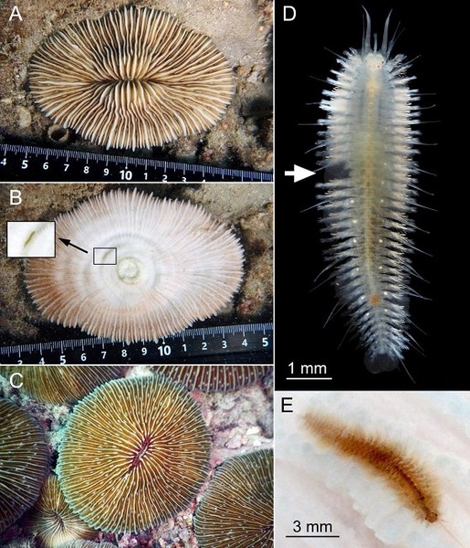 Виды кораллов-хозяев, их симбионты и места обитания. A. Pleuractis moluccensis, вид сверху. B. Тот же коралл, вид снизу. Место расположения симбионта обведено прямоугольником. C. Fungia fungites, вид сверху. D.& Hololepidella martini Britayev et Antokhina, 2025, фотография живого червя. Стрелка указывает на повреждение параподии, вероятно, полученное в результате внутривидового столкновения. E. Симбионт, расположенный вдоль ребер на нижней стороне коралла F. fungites. Источник: авторы исследования