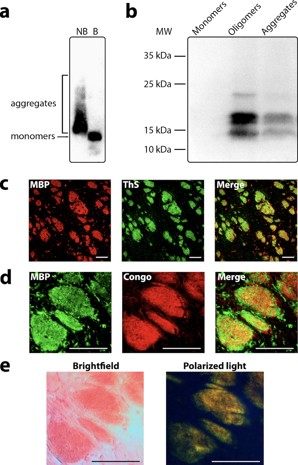 Вместе с тем цитологических данных недостаточно для идентификации белка, образующего амилоидные фибриллы. Дело в том, что помимо МВР миелин содержит и другие белки, которые теоретически могут связывать амилоидспецифичные красители. Для окончательного подтверждения амилоидных свойств исследуемого белка авторы с помощью оригинальной методики провели иммунопреципитацию и очистку нативных фибрилл МВР из мозга крысы. Полученные препараты белка эффективно связывали краситель конго красный и демонстрировали яблочно-зеленое двойное лучепреломление в поляризованном свете — это отличительная особенность всех известных амилоидных фибрилл. Также выделенный белок был окрашен первичными антителами к МВР и вторичными антителами, связанными с частицами золота размером 10 нм. Электронно-микроскопическое исследование показало, что белок выделенный из головного мозга, представлен в виде фибриллярных структур. Эти данные окончательно доказывают, что электронно-плотная линия, которая выявляется в составе миелина, представляет собой не что иное, как амилоидные фибриллы белка МВР.