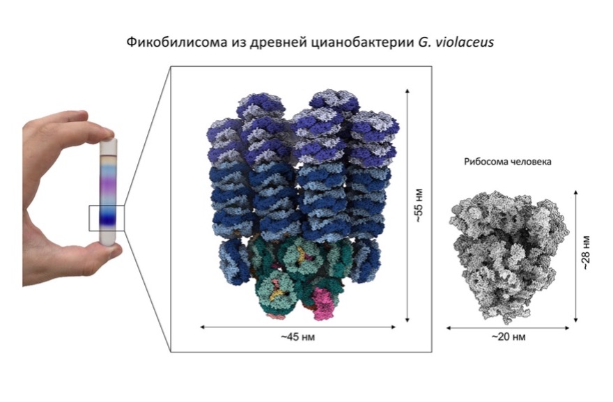 «Строение этой гигантской белковой конструкции, улавливающей свет в клетках цианобактерий, не удавалось установить почти полвека с момента их обнаружения. <…> Гигантская конструкция состоит из более 500 белков. <…> Комплексное исследование, проведенное учеными, позволило впервые создать трехмерную структуру сложного светособирающего комплекса древнейших цианобактерий, описать детальное строение фикобилисом нового типа и их способ регуляции», - сообщили ТАСС в научном центре.