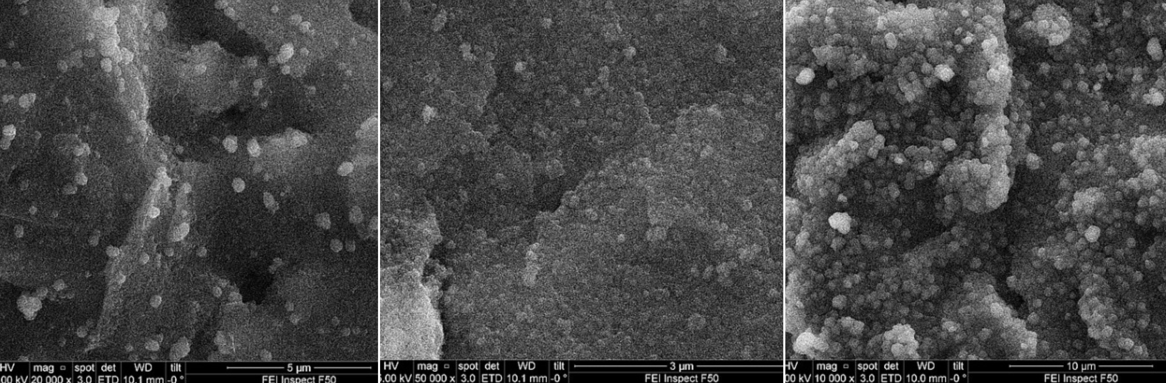 Сканирующая электронная микроскопия (A) гексацианоферрата никеля, (B) берлинской лазури и (C) композита; увеличение A: 20 000, B: 50 000, C: 10 000. Источник: Аркадий Карякин