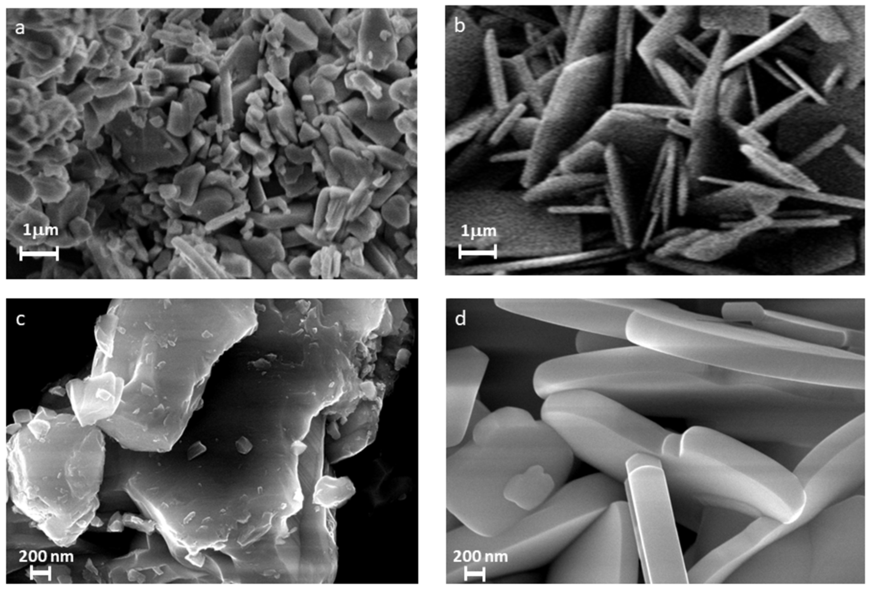 Микроструктура образца, синтезированного твердофазным методом (а, c) и методом расплавленных солей (b, d). Источник: Farid Orudzhev et al. / Molecules, 2025