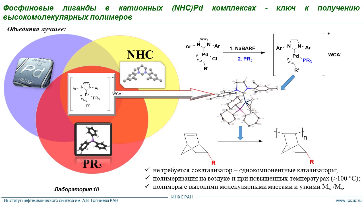 Исследователи из Института нефтехимического синтеза им. А. В. Топчиева РАН (Москва) с коллегами получили серию из 11 новых катализаторов на основе палладия. Химики впервые объединили в одном комплексе три важных компонента: сам палладий, фосфиновый лиганд (фосфорсодержащую органическую молекулу) и карбеновый лиганд. Последнее составляющее образует прочный и элегантный «зонтик» над палладием, не давая ему вступать в ненужные реакции и позволяя выполнять только те, что нужны ученым. Благодаря этому «зонтику» палладий становится более избирательным и точным, словно искусный дирижер, управляющий сложным оркестром химических превращений. Такие комплексы оказались очень активными и при этом стабильными. Более того, новые катализаторы упрощают получение полимеров: они в отличие от большинства аналогов легко работают даже при контакте с воздухом, и поэтому синтез не требует дорогостоящего оборудования.