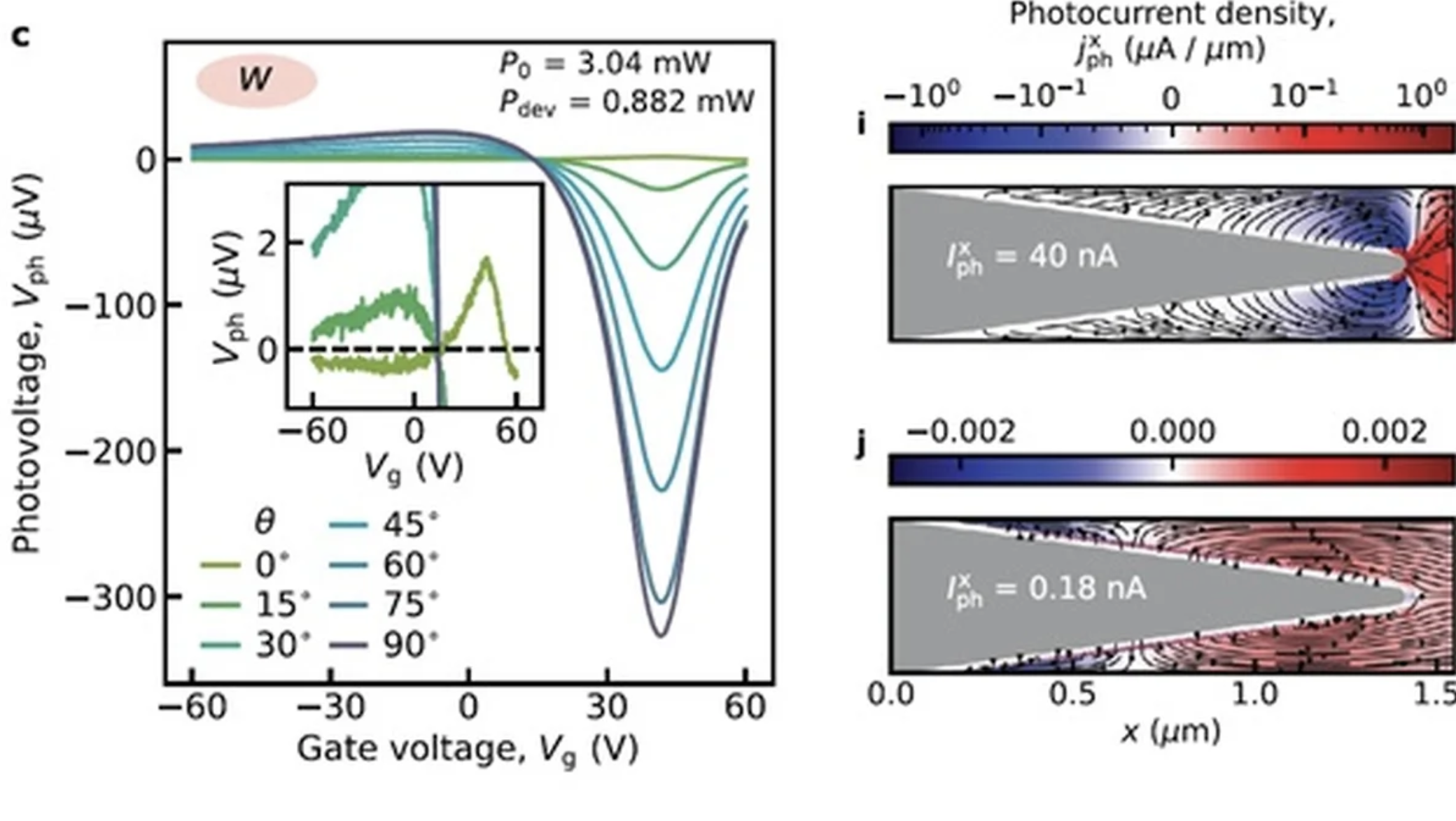 Экспериментальная демонстрация (слева) и теоретическое моделирование (справа) фототока в образце с метаповерхностью типа «пила». Источник: Semkin et al / Advanced Optical Materials, 2025