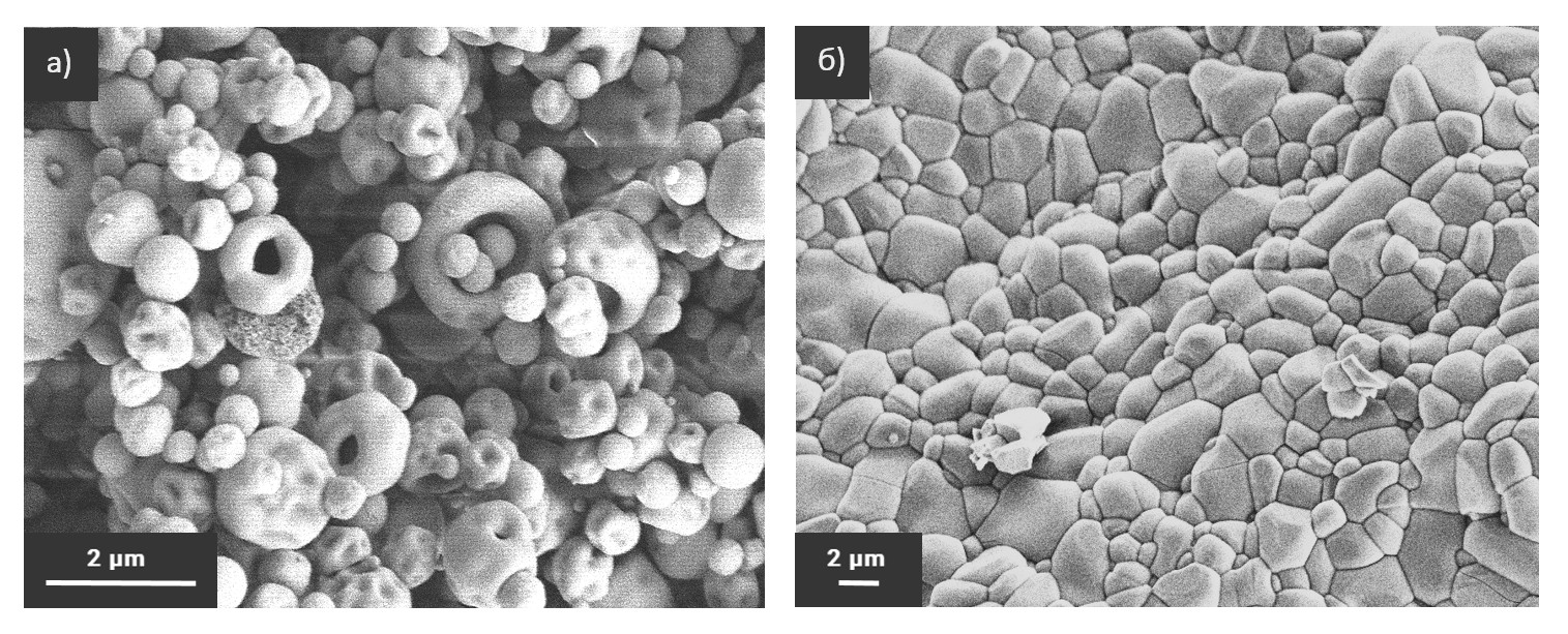 Микрофотографии порошкового прекурсора (а) и полученной из него керамики на основе фосфатов магния (б). Источник: МГУ имени М.В. Ломоносова