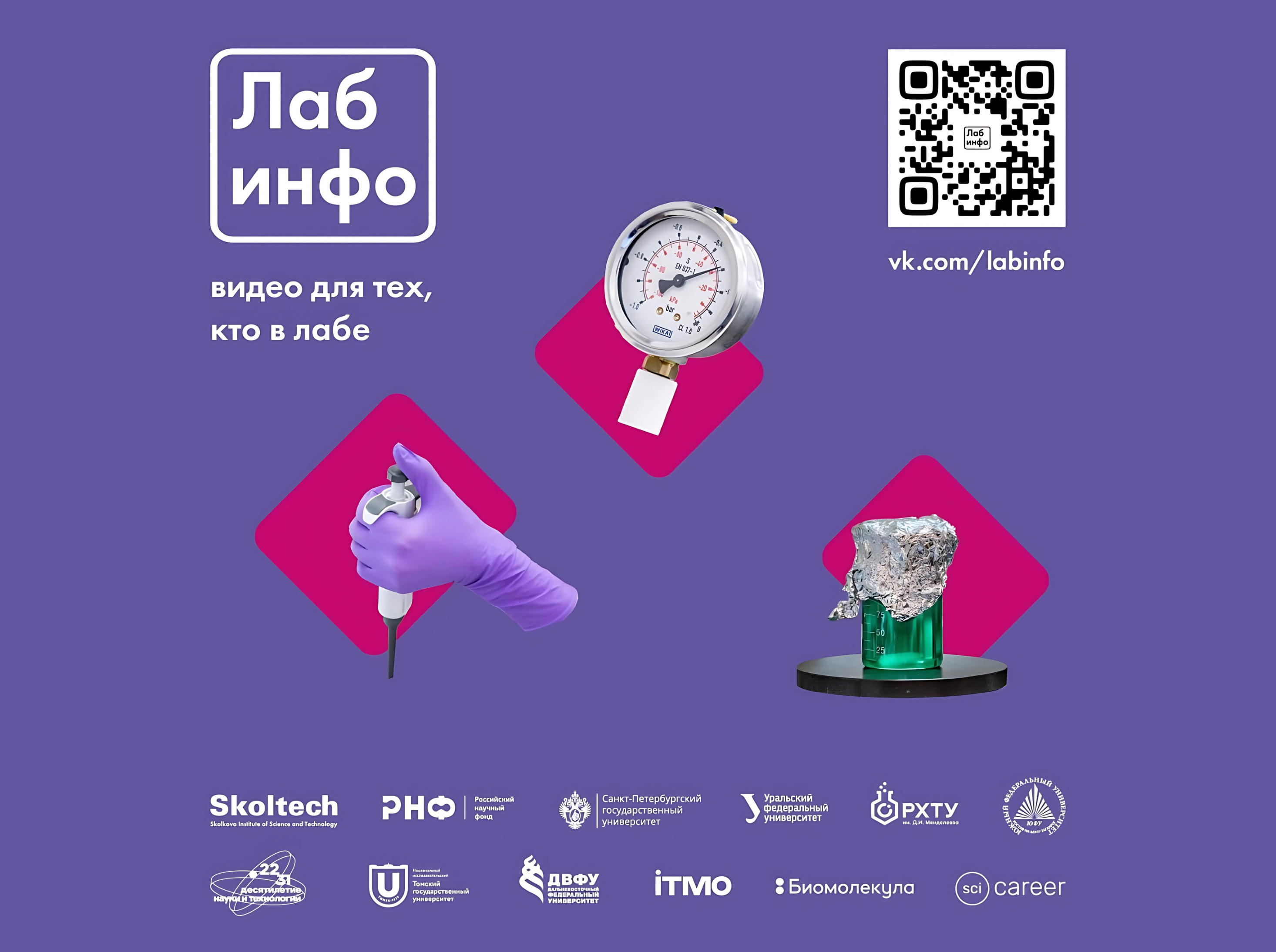 «ЛабИнфо» – это короткометражные обучающие видеоролики, которые знакомят студентов, магистрантов, аспирантов и молодых ученых с правилами корректного использования лабораторных методов и приборов. Проект стремится содействовать повышению уровня подготовки и квалификации российских молодых исследователей.