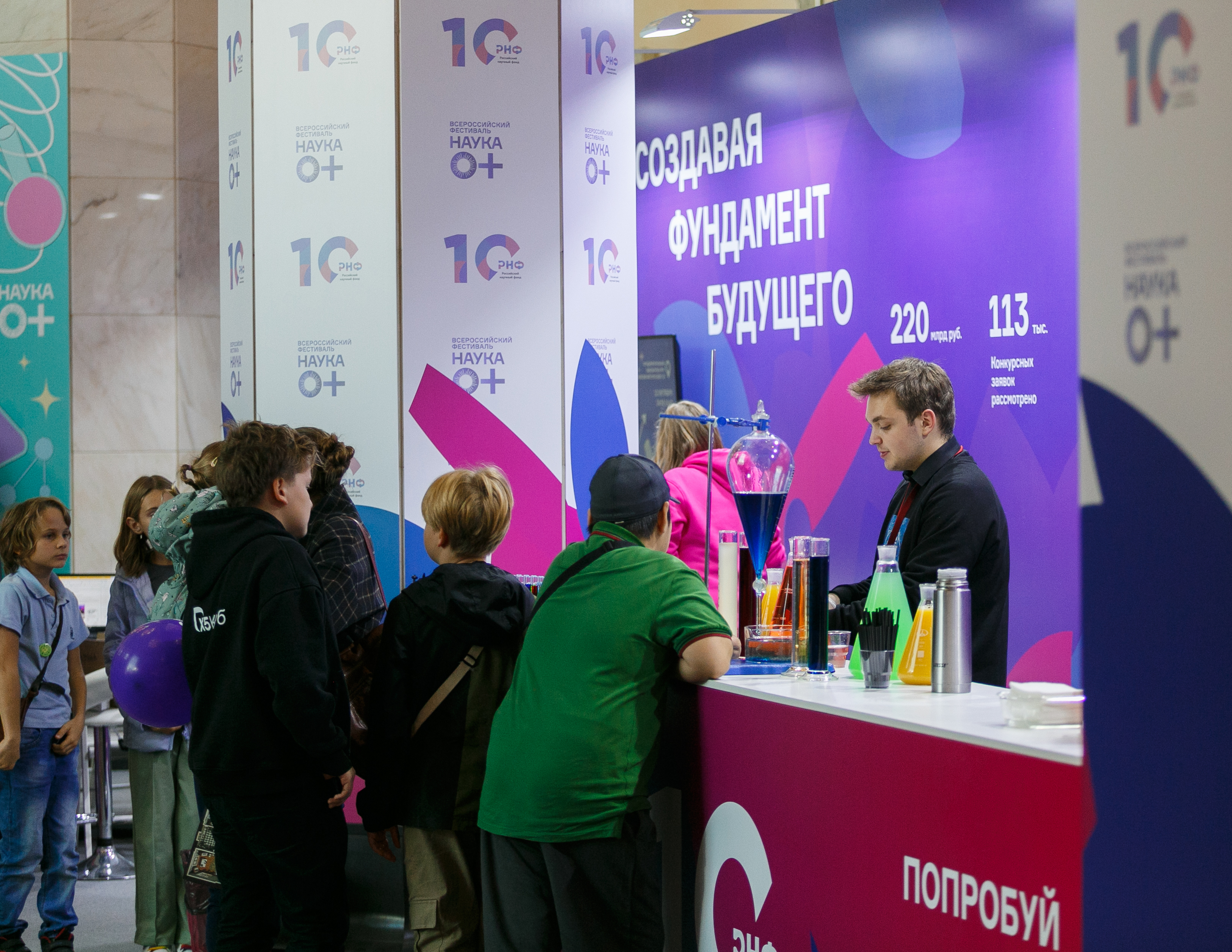 Выставка «Посмотри и потрогай»: выставка научных объектов, с которыми работают российские ученые. Все желающие смогут подержать портативный ранозаживляющий биопринтер в виде пистолета, рассмотреть водоросли в настоящем биореакторе и чашках Петри и посмотреть завораживающие видеоролики, представляющие различные исследования при поддержке РНФ.