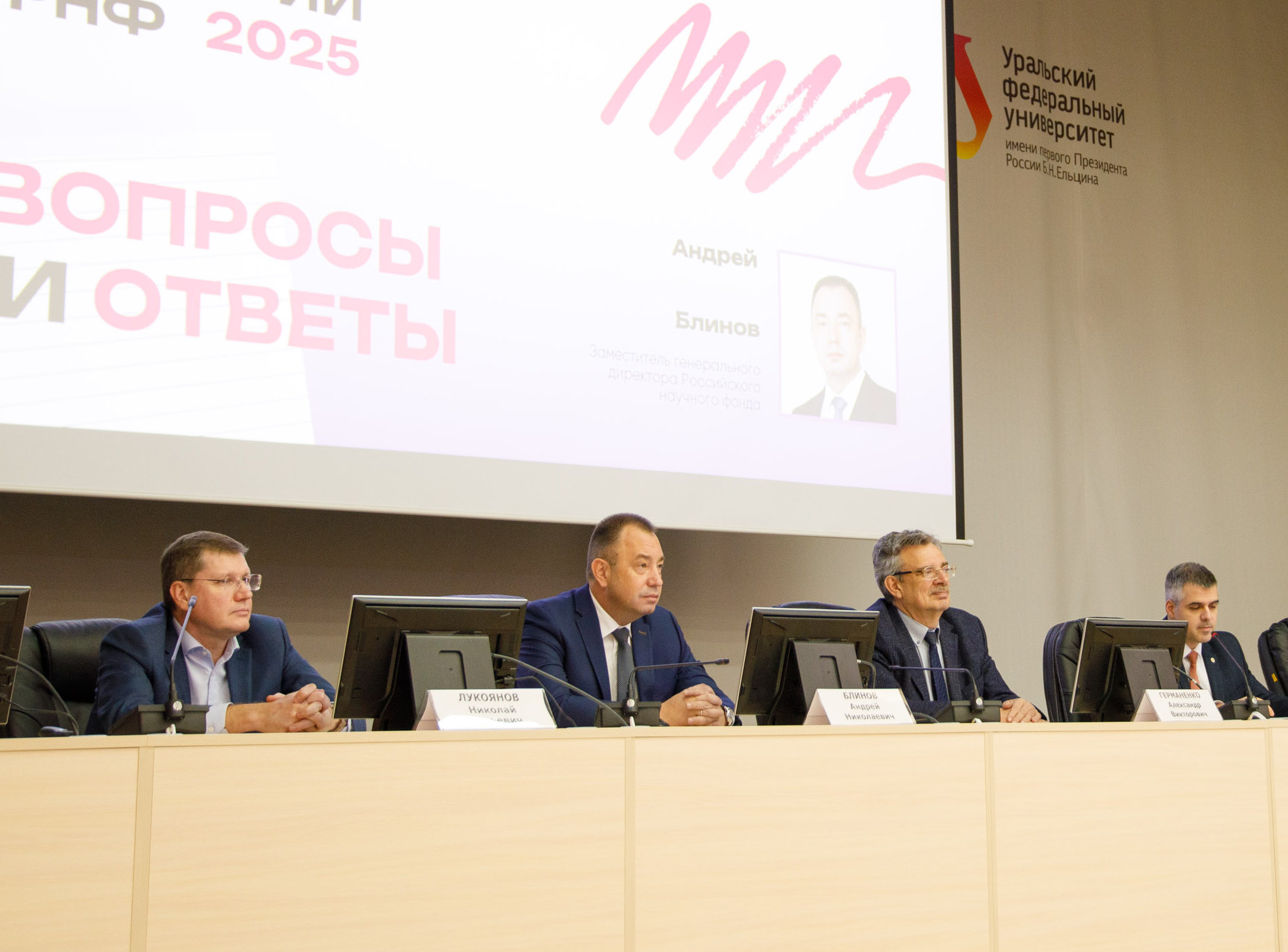 Также в рамках церемонии прошла сессия вопросов и ответов с заместителем генерального директора РНФ Андреем Блиновым. Участники смогли обсудить вопросы, которые волнуют грантополучателей Фонда, и предложили свои идеи по улучшению системы грантовой поддержки науки.