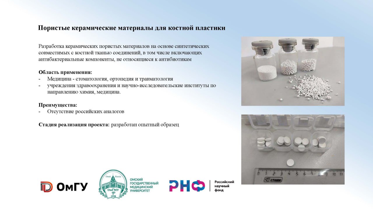 Также ученые ОмГУ рассказали о пористых керамических материалах для костной пластики. Руководитель проекта, кандидат химических наук Светлана Герк вместе с коллегами разрабатывает керамические пористые материалы на основе синтетических совместимых с костной тканью соединений, которые могут применяться в стоматологии, ортопедии и травматологии.
