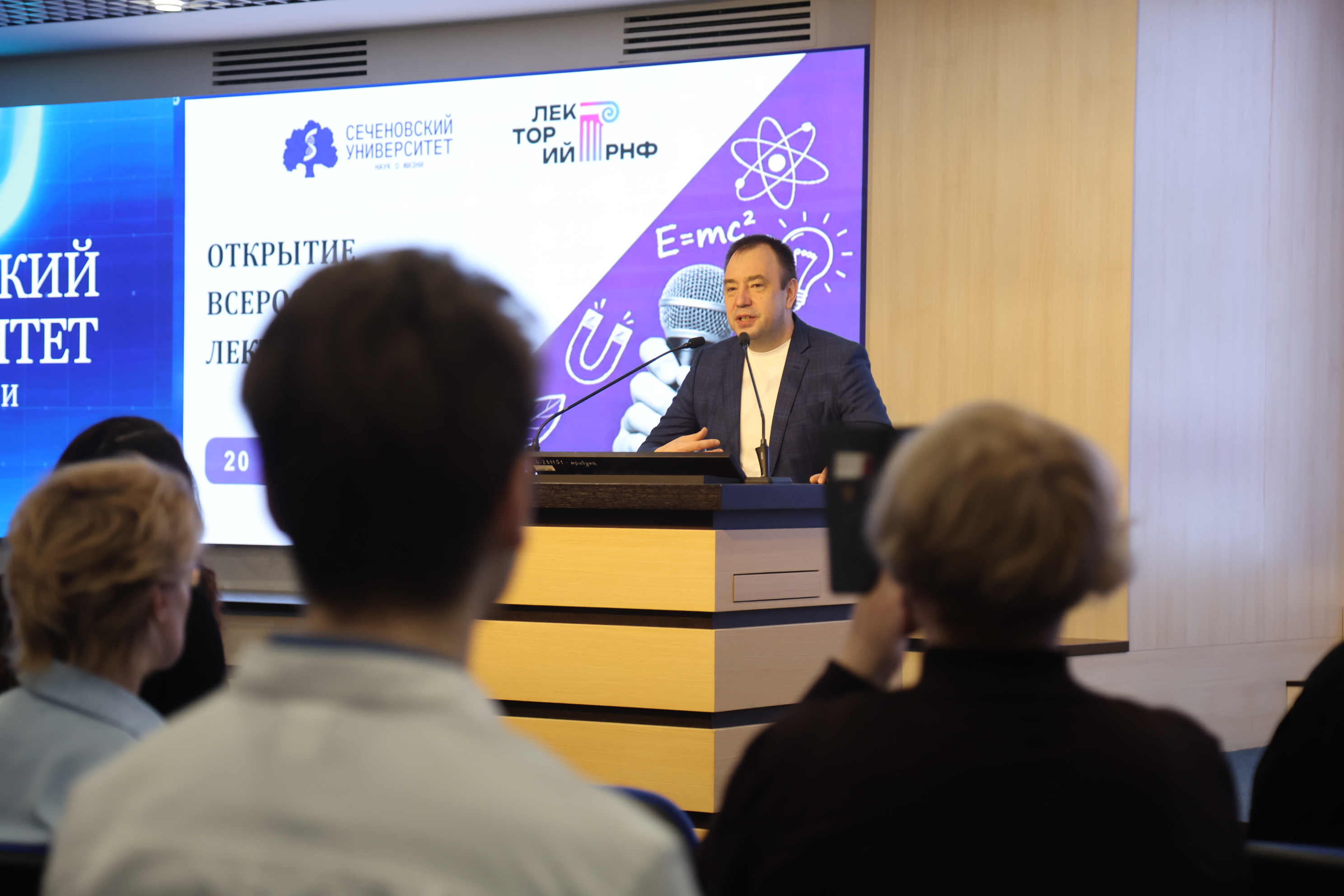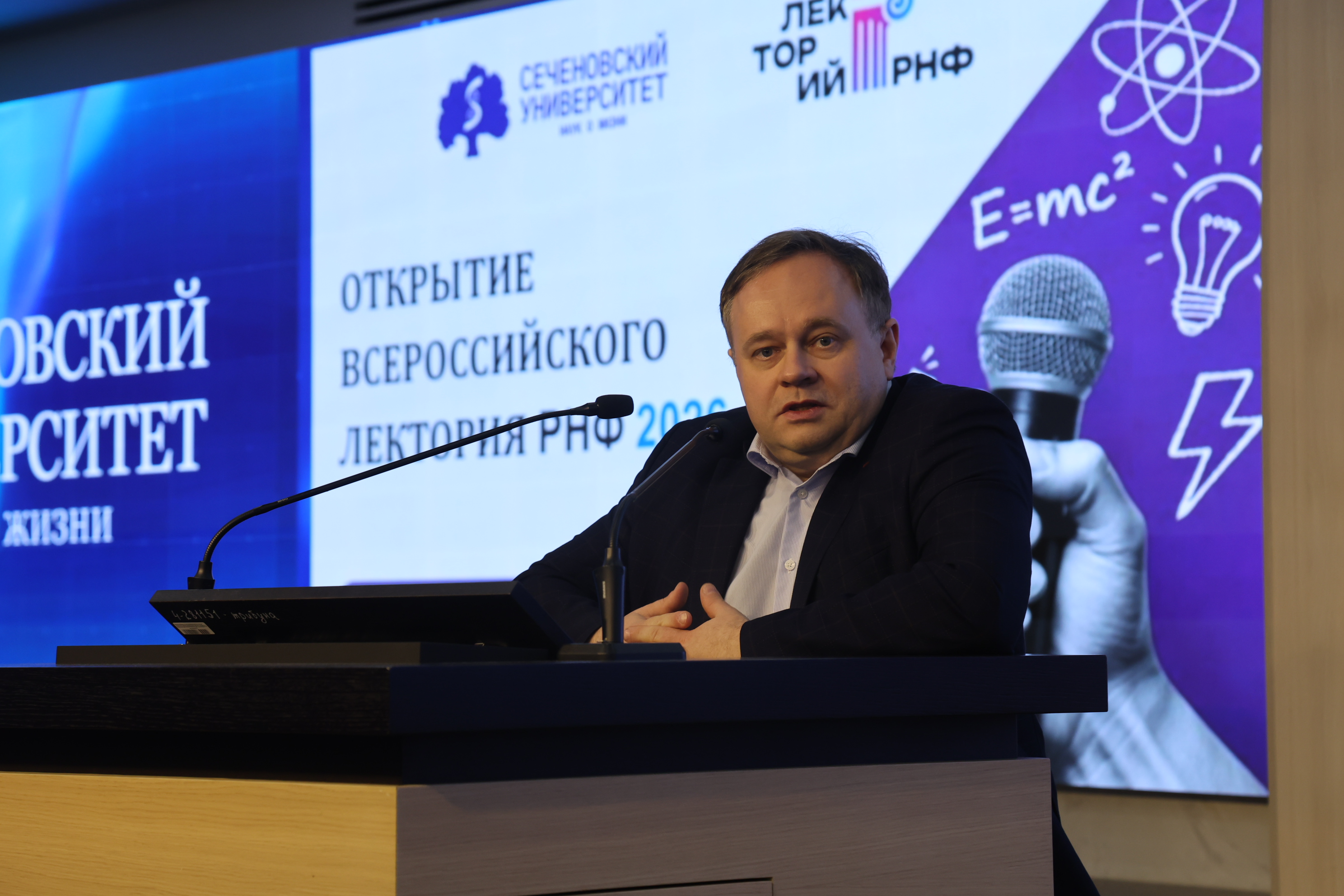 Далее участников приветствовал заместитель генерального директора РНФ Андрей Блинов. Он поблагодарил руководство и научное сообщество Сеченовского Университета за гостеприимство и проведение церемонии открытия. Андрей Блинов отметил, что Всероссийский лекторий РНФ за несколько лет стал флагманским проектом Фонда. Сегодня это уже не просто серия лекций, а большое общее дело, объединяющее сотни городов, научных организаций и тысячи участников по всей стране.«Всероссийский лекторий РНФ — за три года превратился в крупное мероприятие. И он организован не только для общения молодых и зрелых ученых, передачи опыта или рассказа о новых исследованиях. Мы активно привлекаем самых юных участников — школьников. В рамках Лектория они могут прикоснуться к науке, познакомиться с передовыми исследованиями и в будущем, возможно, выбрать свой научный путь».