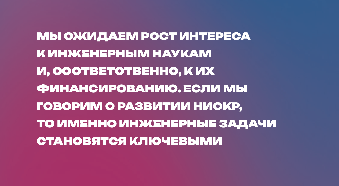 В то же время мы ожидаем рост интереса к инженерным наукам и, соответственно, к их финансированию. Если мы говорим о развитии НИОКР, то именно инженерные задачи становятся ключевыми. Даже в проектах, формально относящихся к физике или химии, все чаще прослеживается запрос на разработку новых материалов.