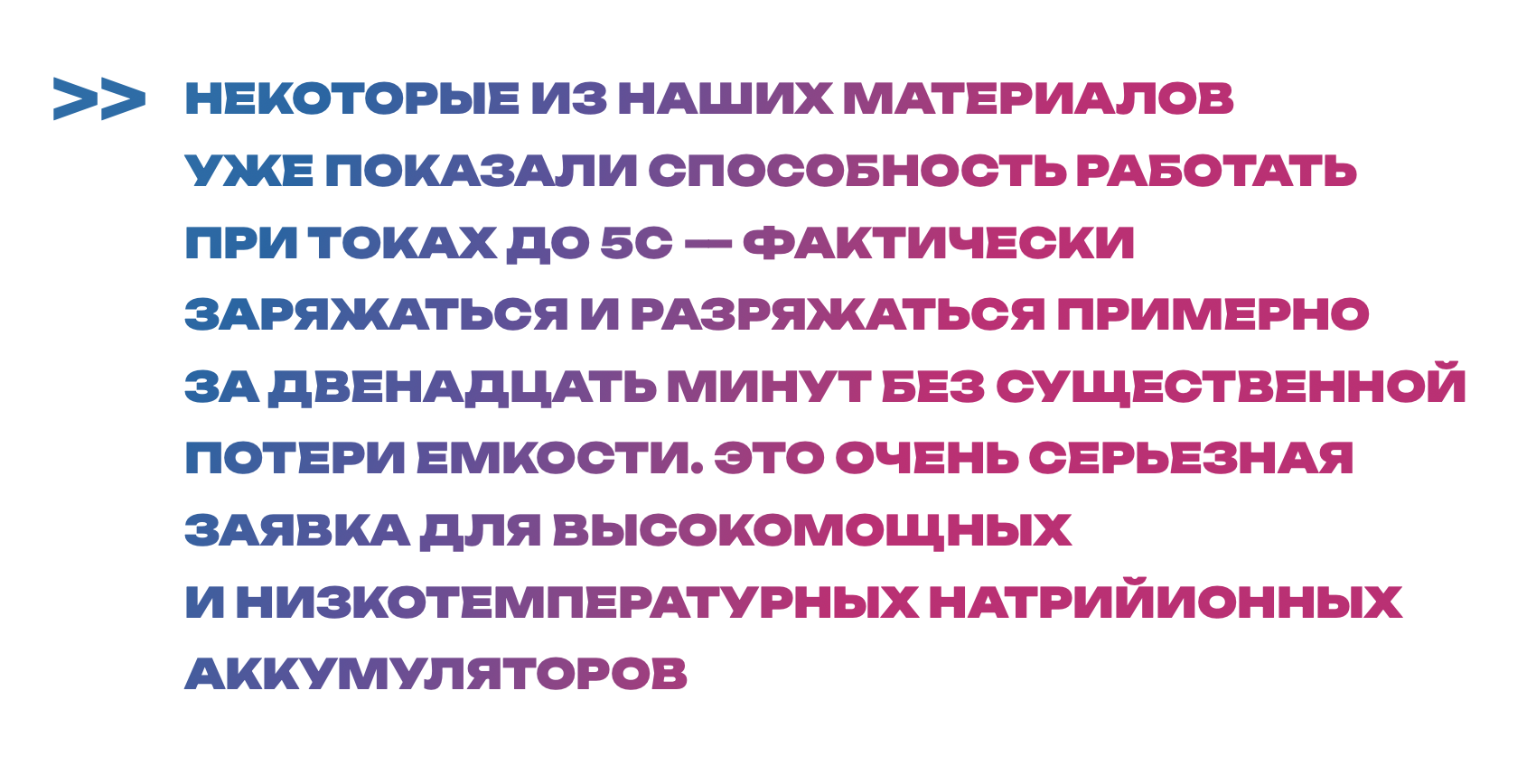 Некоторые из наших материалов уже показали способность работать при токах до 5С — фактически заряжаться и разряжаться примерно за двенадцать минут без существенной потери емкости. Это очень серьезная заявка для высокомощных и низкотемпературных натрийионных аккумуляторов. Задача нынешнего проекта — довести этот научный задел до уровня полноразмерных прототипов и технологических регламентов.