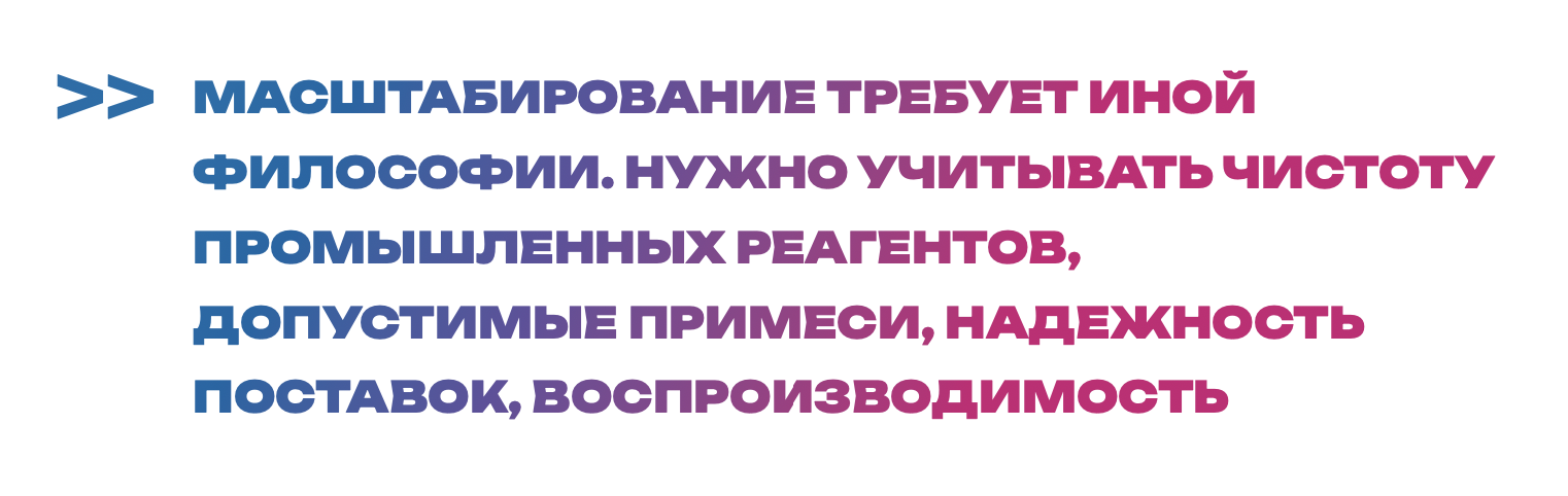 Этот процесс вызывает у ученого наибольшее беспокойство. Одно дело — синтезировать граммы вещества из высокочистых реагентов, допуская, что девять попыток из десяти могут оказаться неудачными, а одна даст тот самый результат. Совсем другое — когда речь идет о килограммах и сотнях килограммов. Ты не можешь позволить себе десять неудачных синтезов по 10 или 100 килограммов каждый — это другие ресурсы, другое оборудование, другие деньги.