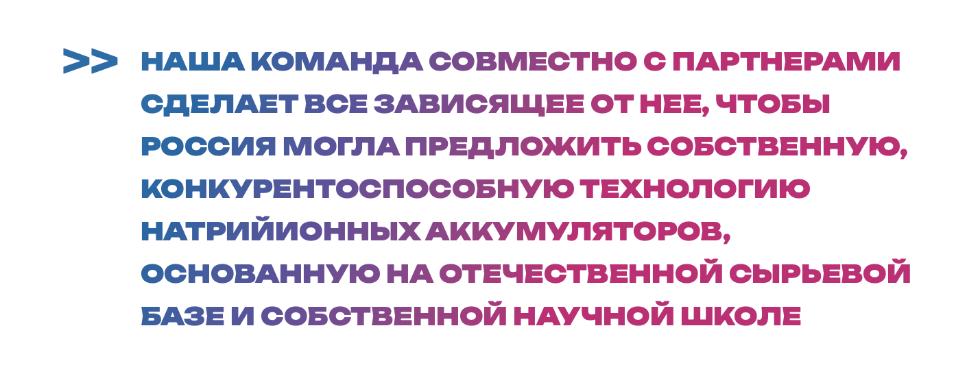 Натрий-ионные аккумуляторы не заменят литий, но точно займут значимое место на рынке. Как я уже говорил, медлить нельзя: если мы будем долго раздумывать, ждать завершения всех научных проектов и только потом начинать разговор о стратегии, — мы неизбежно будем в роли догоняющих. Наша команда совместно с партнерами сделает все зависящее от нее, чтобы Россия могла предложить собственную, конкурентоспособную технологию натрий-ионных аккумуляторов, основанную на отечественной сырьевой базе и собственной научной школе.