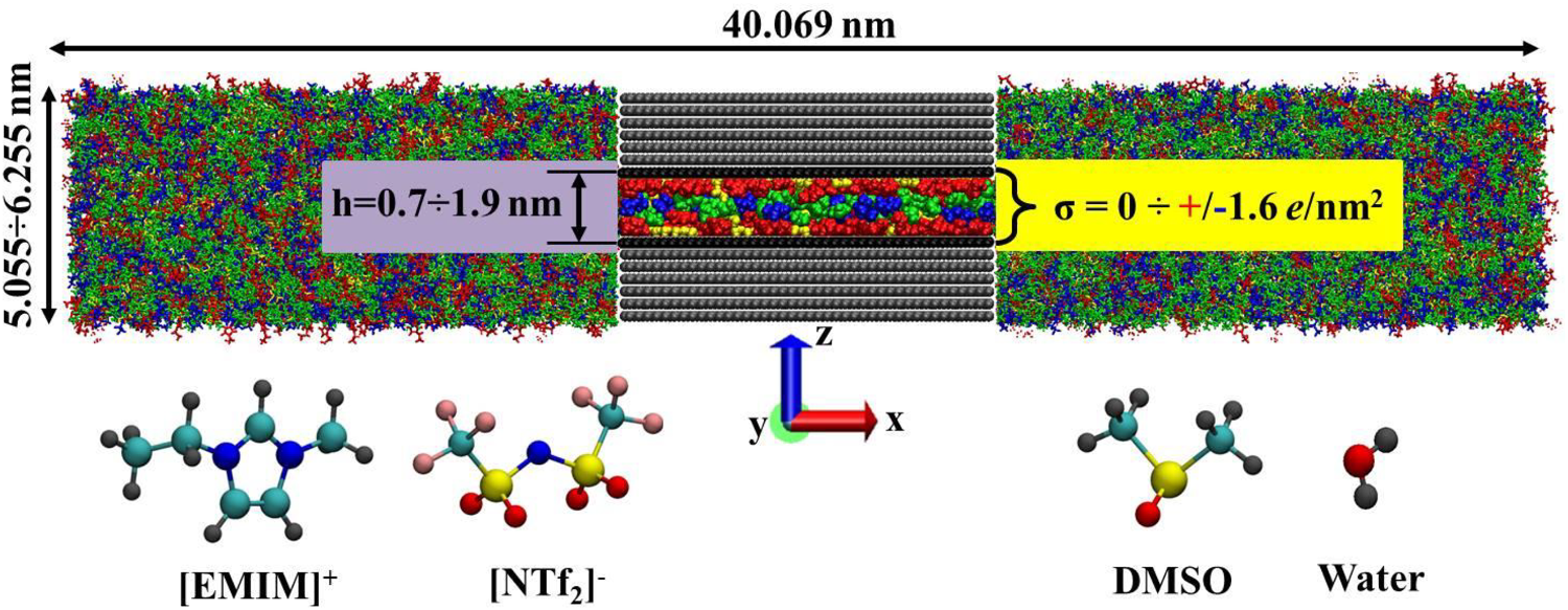![Модель щелевидной поры, заполненной электролитом. Цветом показаны разные компоненты: ионы [EMIM]+ — красным, [NTf₂]⁻ — синим, молекулы растворителя DMSO — зеленым, вода — желтым. Черные слои обозначают заряженные стенки поры, серые — незаряженные. На схеме также видно, из каких атомов состоят молекулы: сера отмечена желтым, кислород — красным, фтор — розовым, водород — серым, углерод — голубым, азот — синим. Источник: Gurina et al. / Electrochimica Acta, 2025](/images/foto/11-1.png)
