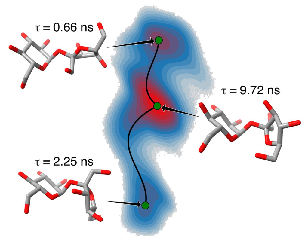 Поверхность свободной энергии, характеризующая переходы между конформерами гликозидной связи молекулы сахарозы в воде. Числа соответствуют характерным временам жизни конформеров, взвешенное среднее которых совпадает с экспериментальными измерениями. Источник: МФТИ