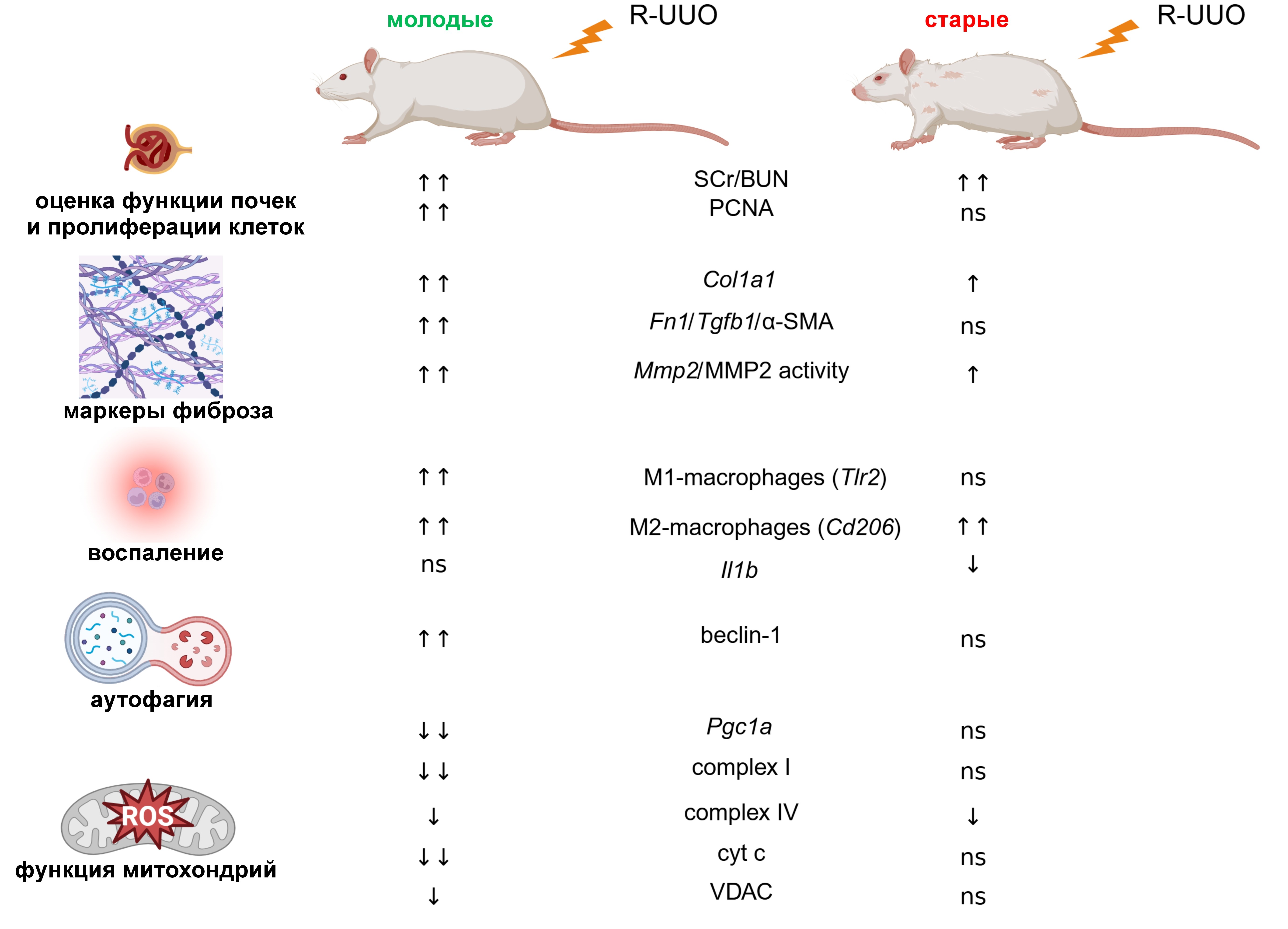 Оказалось, что в ответ на повреждение в почках молодых крыс клетки стали активнее делиться, чтобы скорее восстановить ткань. Кроме того, в органах запустился воспалительный процесс, необходимый для начала заживления. При этом у животных из этой группы был повышен уровень маркеров рубцевания ткани.