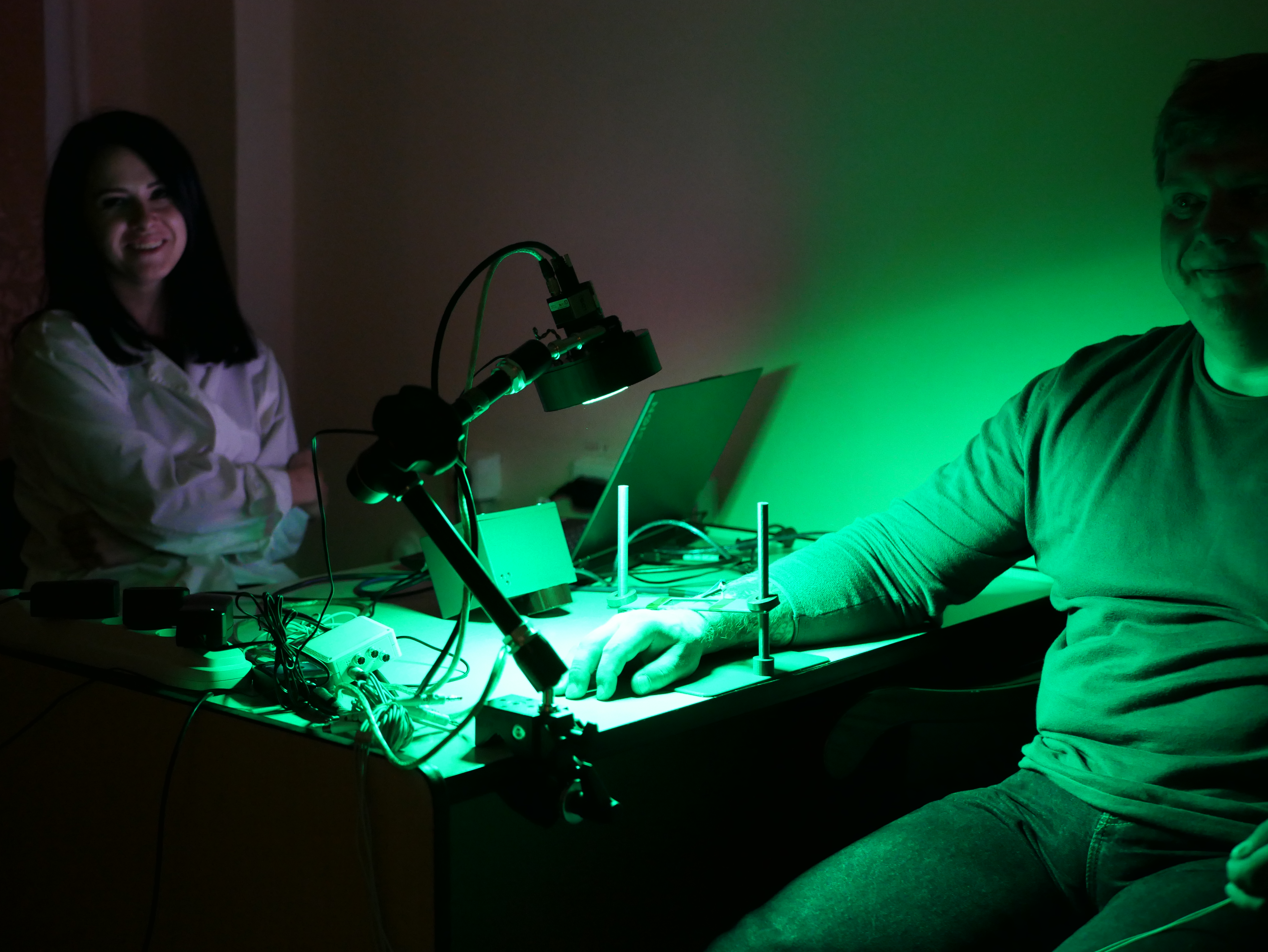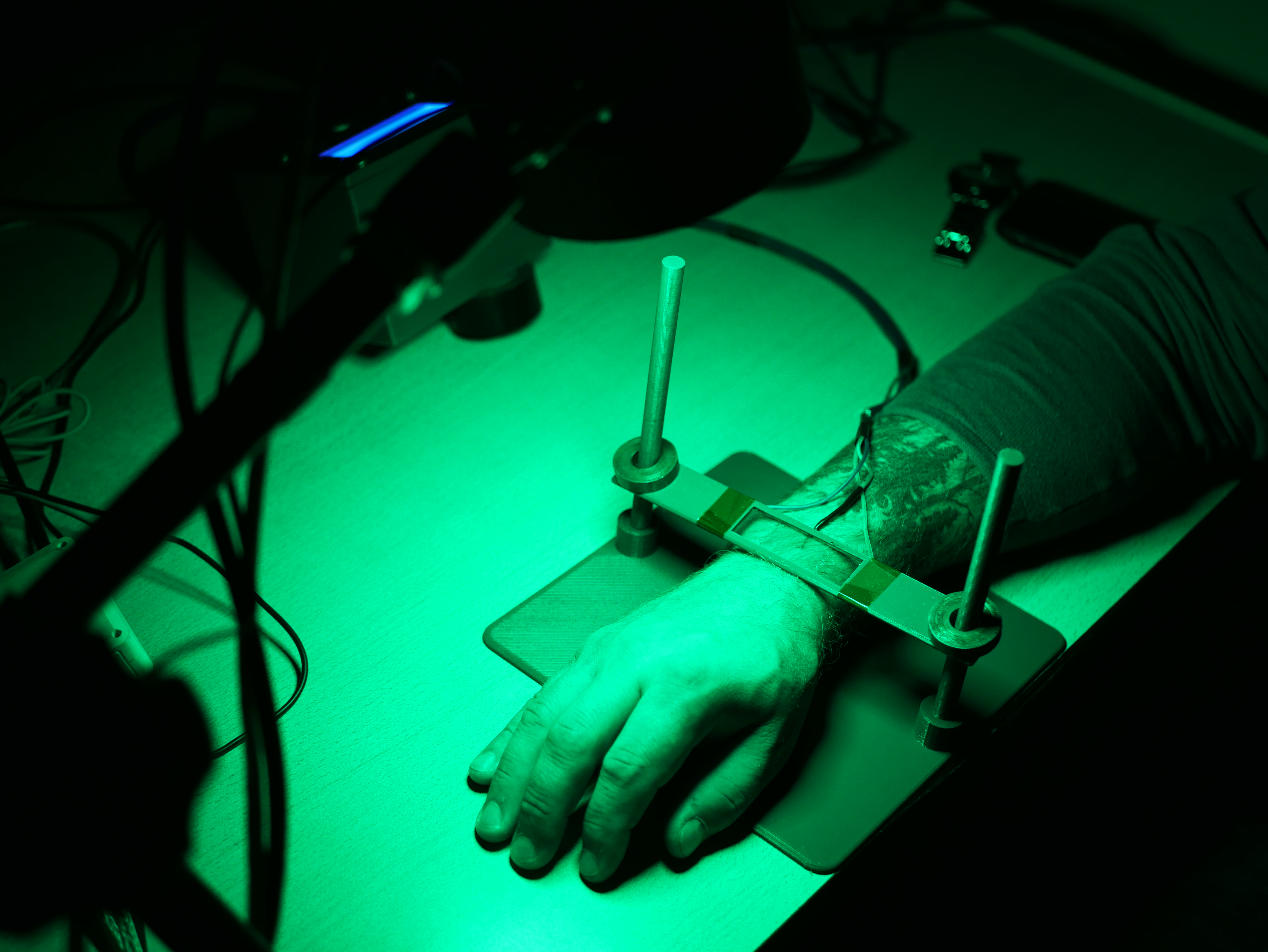 Авторы разработки использовали стандартную установку для измерения скорости кровотока: камеру с зеленым светом, которая фиксировала участок кожи на предплечье пациента. Зеленый свет хорошо поглощается гемоглобином — красным пигментом крови, поэтому по его интенсивности можно отслеживать изменения давления в сосудах. Когда пульсовая волна достигает мелких сосудов под кожей, капиллярная сеть сжимается, становится плотнее и поглощает больше зеленого света. Отраженный сигнал, фиксируемый камерой, при этом ослабевает. Таким образом, изменение яркости позволяет регистрировать пульсовую волну.