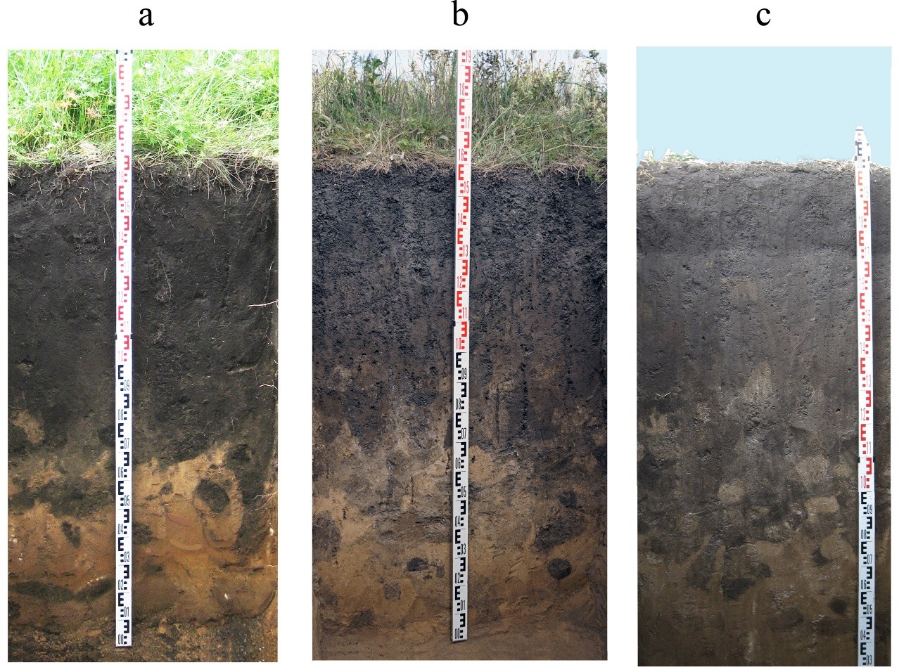Почвенные разрезы. a — типичный разрез заповедного чернозема (Ямская степь, участок «Котеневские верхи»); b — чернозема под непахавшимся выгоном-сенокосом (участок «Сафоновка»); c — пахотный чернозем участка «Юрьевка». Источник: Мария Смирнова
