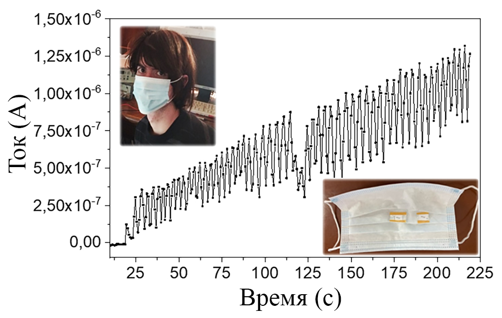 Сенсор на медицинской маске, на графике показано изменение сигнала при выдохе. Источник: Артем Иванов / ИФП СО РАН