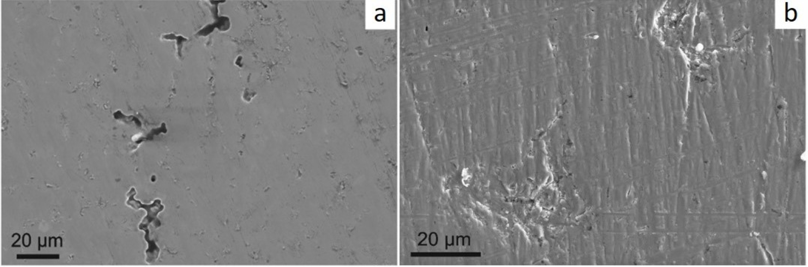 Микроскопические изображения сплава, полученные методами растровой электронной микроскопии, после коррозионных испытаний. а — при минимальной дозе облучения, b — при максимальной дозе облучения