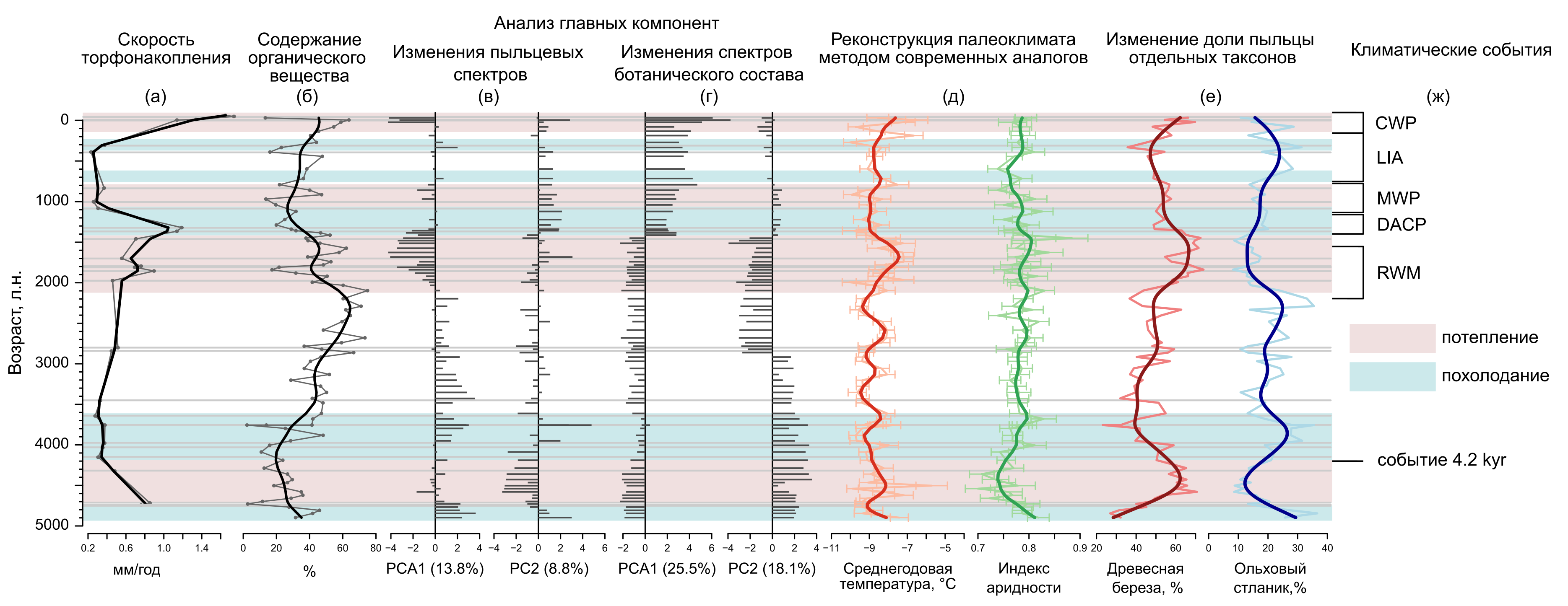 Диаграмма, суммирующая основные результаты исследования: ключевые изменения спектров пыльцы (в) и ботанического состава торфа (г) не связаны с пеплопадами (тонкие серые линии), а соотносятся с основными климатическими событиями позднего голоцена (ж). (CWP – англ. Contemporary Warm Period – потепление новейшего времени, LIA – англ. Little Ice Age – Малый ледниковый период, MWP – англ. Medieval Warm Period – Средневековый климатический оптимум , DACP – англ. "Dark Age" cooling – похолодание «Темных веков», RWP – англ. Roman Warm Period – Римский климатический оптимум). Источник: Валерий Пименов