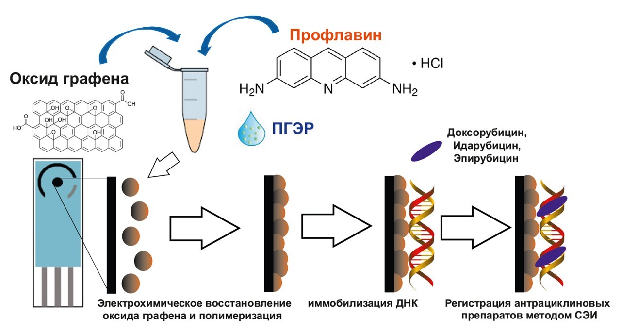 Полученный материал авторы нанесли на электроды — элементы, проводящие ток, — а затем «закрепили» на них молекулы ДНК, которые были необходимы для связывания антрациклиновых препаратов.