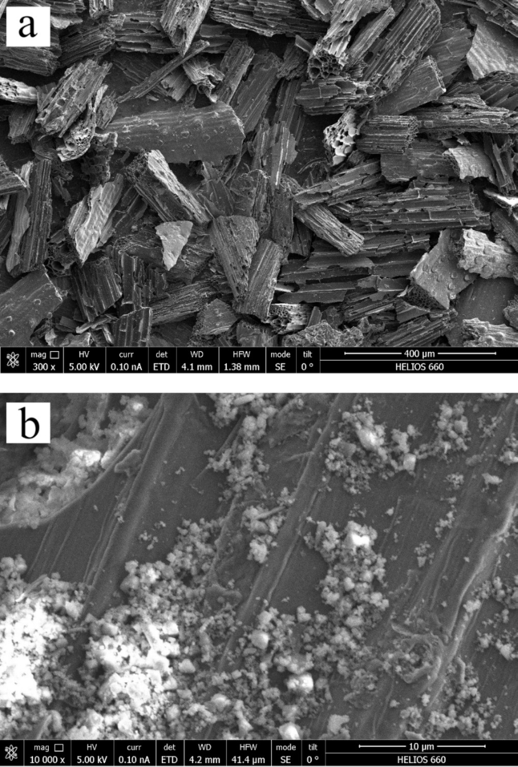 Микрофотографии чистого биоугля (a) и модифицированного наночастицами MIL(Fe)-100 (b). Источник: TatianaBauer et al. / Environmental Nanotechnology, Monitoring & Management, 2026