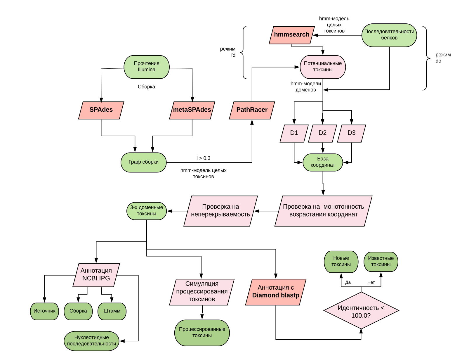 Схема работы инструмента CryProcessor. CryProcessor представляет собой основанный на скрытых Марковских моделях (HMM, Hidden Markov Model) алгоритм, написанный на языке Python3.7 и обладающий высокой пропускной способностью (возможностью обрабатывать большое количество последовательностей). Он позволяет работать как со стандартными файлами для записи биологических последовательностей (в формате FASTA), так и с сырыми данными секвенирования, полученных при помощи платформы Illumina в формате FASTQ. Источник: Shikov et al. / Toxins, 2020