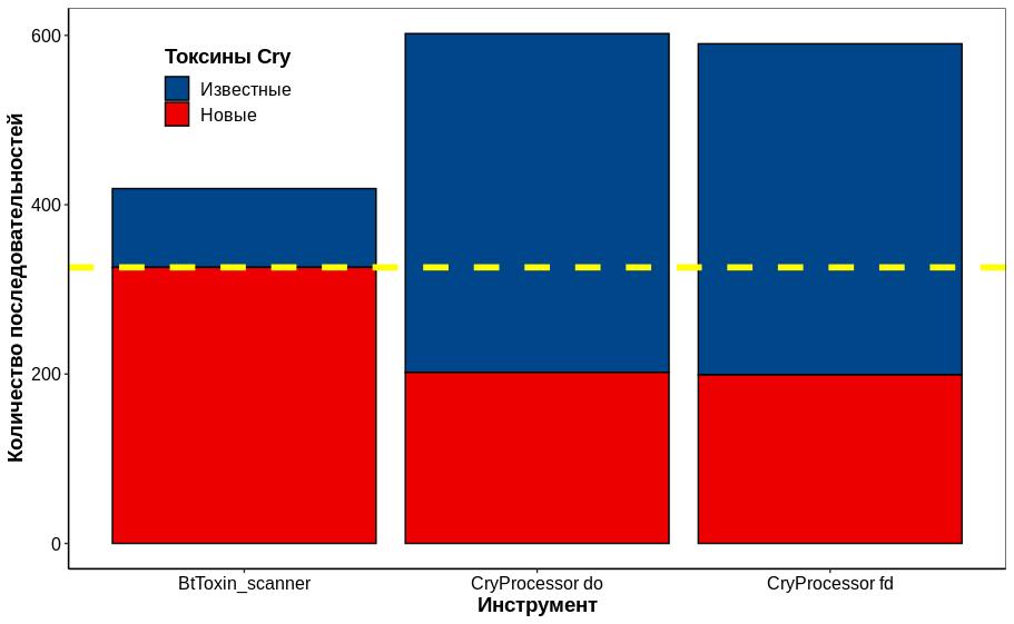 Эффективность CryProcessor. На графике наглядно продемонстрировано преимущество CryProcessor над его аналогом — программой BtToxin_scanner. В обоих режимах работы CryProcessor не только находит больше токсинов, но и более эффективно определяет, какие именно из последовательностей действительно являются новыми, вследствие более полной и обновлённой базы данных, лежащей в основе работы программы. Большая часть последовательностей токсинов Cry, найденных BtToxin_scanner как новые, такими не являются. Источник: Кирилл Антонец