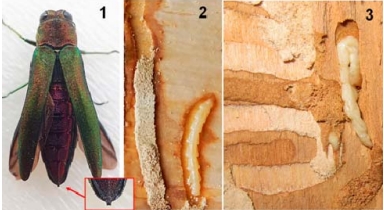 Жук и личинки ясеневой златки в коре деревьев. Источник: ФИЦ КНЦ СО РАН