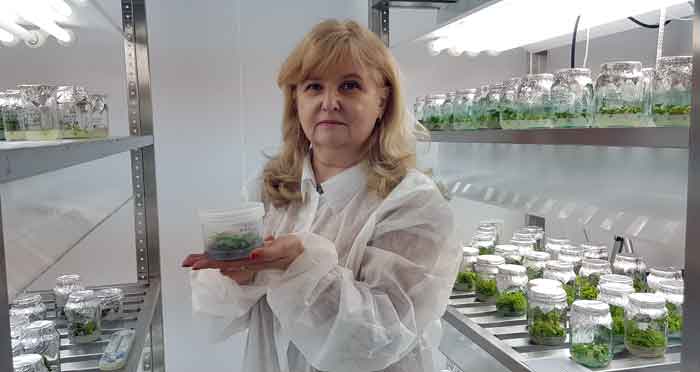 — Посадочный материал, продающийся в магазинах, часто заражён различными заболеваниями. Садоводы, естественно, недовольны урожаем, который болезни снижают на 30, а то и 90 процентов. Выращенные же у нас деревья и кустарники здоровы и устойчивы к болезням, — говорит заведующая отделом биологии развития растений, биотехнологий и биобезопасности, доктор биологических наук Ирина Митрофанова. — Растения нельзя излечить химией, да мы такую цель и не ставим. Мы «очищаем» от вирусов меристему — верхушку, наиболее активную часть растения, способную к делению и образованию новых клеток. Помещаем её в пробирку с определённым химическим реактивом — вироцитом и, воздействуя антисептиками, освобождаем от бактерий и грибов. Затем погружаем в питательную среду и выращиваем в ней здоровые микропобеги. Если, скажем, стоит задача получить безвирусные экземпляры, подбираем условия, освещение, температуру, состав питательной среды, фитогормоны, регуляторы роста для всех этапов множения побегов и их укоренения. Процесс, в зависимости от культуры, занимает от трёх месяцев до двух лет.