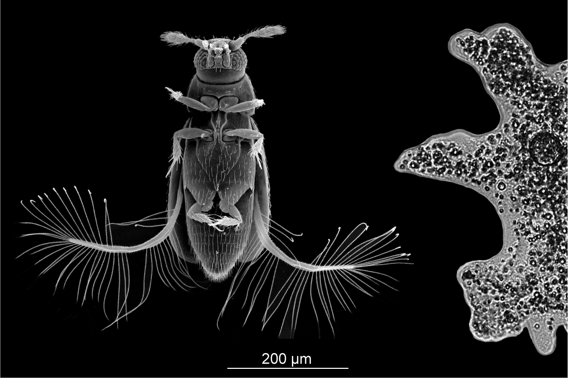 Эта работа проливает свет на одно из замечательнейших явлений эволюции – миниатюризацию, то есть исключительно сильное уменьшение размеров тела животных по сравнению с предковыми формами. У насекомых миниатюризация проходила независимо в нескольких группах и привела к появлению видов, размеры которых составляют десятые доли миллиметра, что сопоставимо с размерами одноклеточных организмов, таких как обыкновенная амёба или инфузория-туфелька. При этом яйцевые наездники, жуки-перокрылки, миниатюрные комары-звонцы и многие другие микронасекомые – это многоклеточные животные, демонстрирующие сложные формы передвижения и поведения.