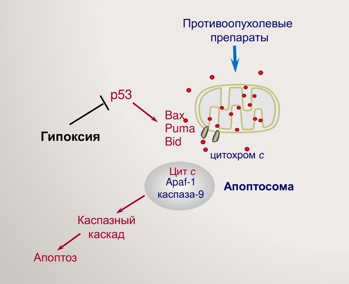 Биологи смоделировали условия гипоксии для клеток опухолей кишечника и легких. Раковые клетки культивировали в условиях гипоксии либо обрабатывали химическим веществом, которое действовало на них таким же образом, как и недостаток кислорода. Эксперимент показал, что это вызвало уменьшение количества белков семейства Bcl-2, которые обычно создают поры в митохондриях. Поэтому их оболочки оставались целыми, и цитохром с не мог попасть в цитоплазму и вызвать апоптоз. Далее ученые исследовали причину, по которой в раковых клетках снизилось количество этих белков. Оказалось, что при гипоксии в клетках не работает белок-регулятор р53, который обеспечивает экспрессию (то есть считывание информации с гена и синтез белка) белков семейства Bcl-2. Для того чтобы вернуть опухоль на путь программируемой смерти, нужно искусственно — например, с помощью лекарств — активировать р53.