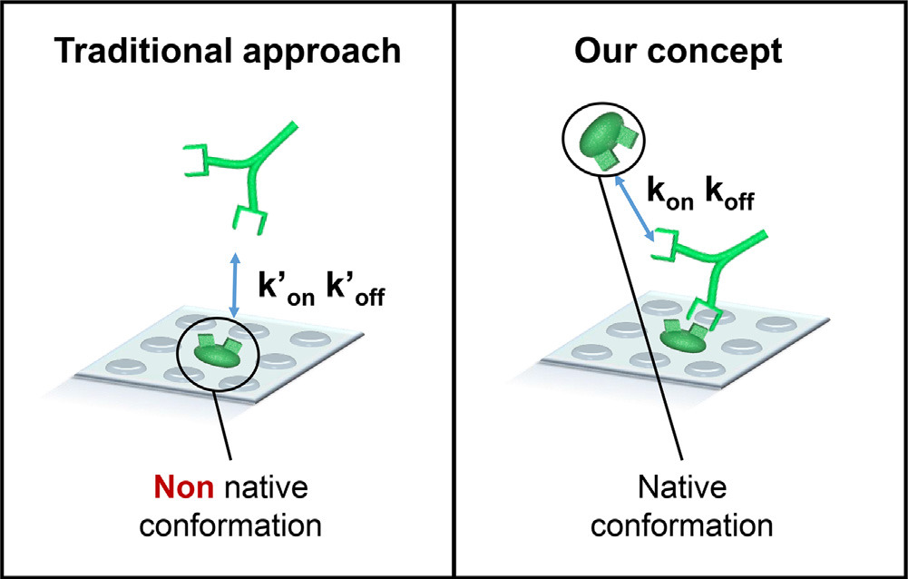 Таких «рук» у него не одна, а две или больше. Одной из них антитело держится за неподвижную мишень, а другими «ловит» подвижные мишени. Этот процесс отражает подлинную (нативную) активность антитела, которую теперь можно измерить численно. Более того, такая схема позволяет, с одной стороны, закрепить на стекле аутоантитела из сыворотки крови, сохраняя при этом их естественную форму, а с другой, максимально избежать присоединения других компонентов, которые могут сильно исказить получаемые данные.