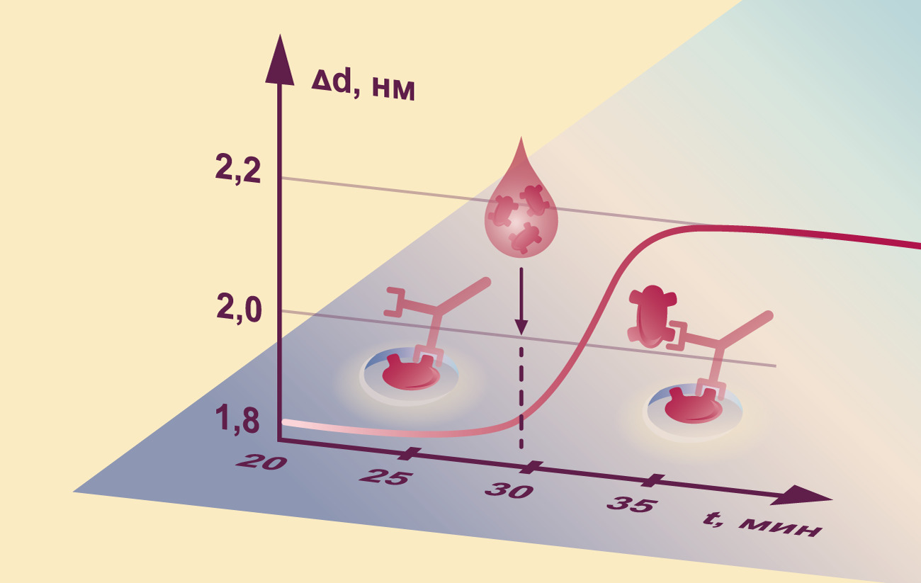 По поверхности стекла исследователи пропускают капельку сыворотки крови пациента, и начинается ее взаимодействие с мишенью. Если в сыворотке есть аутоантитела, они находят мишень и прикрепляются к ней, увеличивая толщину слоя на стекле. Под стеклом располагается интерферометрическая система, разработанная в ИОФ РАН. Этот уникальный оптический регистратор позволяет измерять толщину молекулярного слоя в любой точке стекла и следить за ее изменением в режиме реального времени.