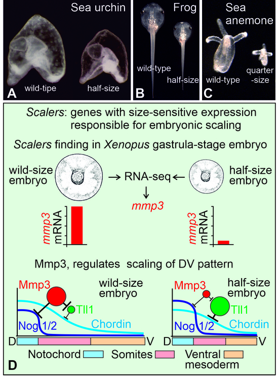 Проанализировав in silico около полумиллиона вариантов различных математических реакционно-диффузионных моделей самоорганизации морфогенетических градиентов, авторы выяснили, что в том случае, когда такая модель способна воспроизводить скейлинг градиента при изменении размера реактора, она действительно всегда имеет в своем составе белок, концентрация которого при этом резко меняется. Такие белки, играющие роль датчиков размера и названные авторами скейлерами, необходимы для правильного скейлинга морфогенетических градиентов. На основе полученных данных, был разработан метод прицельного поиска генов, кодирующих скейлеры, у реальных эмбрионов. В результате на экспериментальной модели эмбрионов шпорцевой лягушки авторы выявили гены, которые действительно резко меняли свою экспрессию в ответ на изменение размера эмбриона (Рис. 1D). Интересно, что число таких генов оказалось крайне небольшим (около двадцати). Для одного из них, гена секретируемой металлопротеиназы 3 (Mmp3), впервые был описан неизвестный ранее молекулярный механизм, позволяющий подстраивать под размер эмбриона масштаб диффузионных градиентов морфогенных белков Chordin и Noggin1/2 (Рис. 1D). В период раннего развития именно эти градиенты определяют разметку клеточных территорий, дифференцирующихся затем в основные зачатки эмбриональной оси тела - нервную систему, хорду, сомитную мезодерму и вентральную мезодерму (Рис. 1D).
