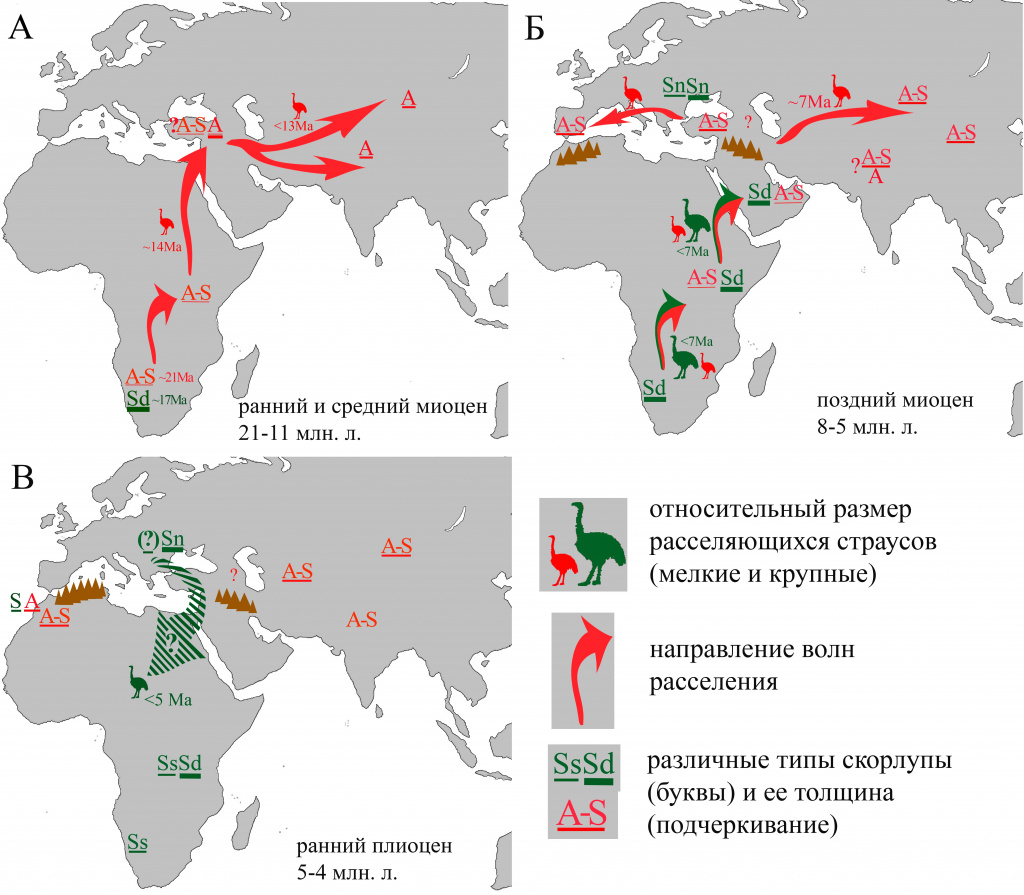 Дальнейшая эволюция этих птиц происходила в Евразии на протяжении позднего миоцена (примерно 5-8 миллионов лет назад). Для этой эпохи характерно постепенное похолодание и иссушение климата – на обширных территориях Евразии в позднем миоцене распространились открытые саванноподобные ландшафты, характерным обитателями которых были еще довольно примитивные страусы. Эти крупные нелетающие птицы в позднемиоценовое время расселились крайне широко – на восток до Монголии и Китая и на запад до Испании и Канарских островов. По мере иссушения климата скорлупа яиц миоценовых страусов менялась, адаптируясь к новым климатическим условиям. Около 8 миллионов лет назад на территории Северного Причерноморья (Балканы, Молдова и южная Украина) сформировался новый тип некрупного страуса со скорлупой, похожей на скорлупу современных видов – это и был их предок. В плиоцене (5–4 миллиона лет назад) эта форма проникла в Африку, где довольно быстро вытеснила доживавшие там свой век примитивные аборигенные виды (о которых известно очень мало!), и сохранилась до наших дней в виде сомалийского страуса (Struthio molybdophanes), населяющего восточную Африку.