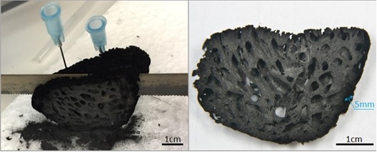 Это побудило ученых к разработке новых и более прочных карбонизированных каркасов из спонгина, которые получились бы при нагревании до 1200°C. Авторы исследования предположили, что вещество может быть превращено в углерод при достаточно высоких температурах и сохранить свою форму и уникальную структуру. Для проверки теории ученые поместили спонгин в печь для плавки металла, нагретую до 1200°C. Другие биологические материалы, например шелк и человеческий коллаген, при такой температуре превращаются в бесполезный угольный порошок. Но спонгин после нагревания в течение часа полностью сохранил свою микро- и наноструктуру, хотя и потерял 70% объема. При этом он остался настолько прочным, что из него удалось вырезать разнообразные фигуры. Дальнейшее изучение с помощью микроскопа и дифракции (отслеживания движения) электронов показало, что спонгин полностью превратился в графитовую губку, то есть сохранил свой внешний вид, но внутри превратился в графит.