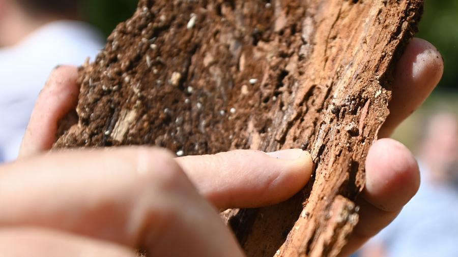 Фото: кора дерева, зараженная жуком-короедом. Источник: Global Look Press/dpa/Patrick Seeger