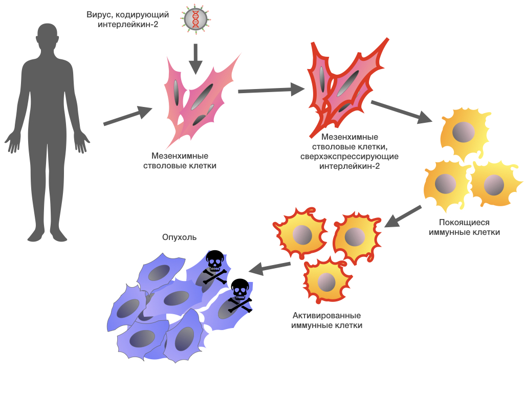 «Мы представили первые данные исследований in vitro, которые показывают, что МСК со сверхэкспрессией цитокина интерлейкин-2 способны активировать иммунные клетки. В таком случае повышается количество «включенных» Т-лимфоцитов, натуральных киллеров и ТНК-клеток, которые отвечают за уничтожение опухолевых клеток», — рассказал один из авторов статьи, Валерия Соловьева, кандидат биологических наук, руководитель проекта, старший научный сотрудник Института фундаментальной медицины и биологии Казанского (Приволжского) федерального университета.
