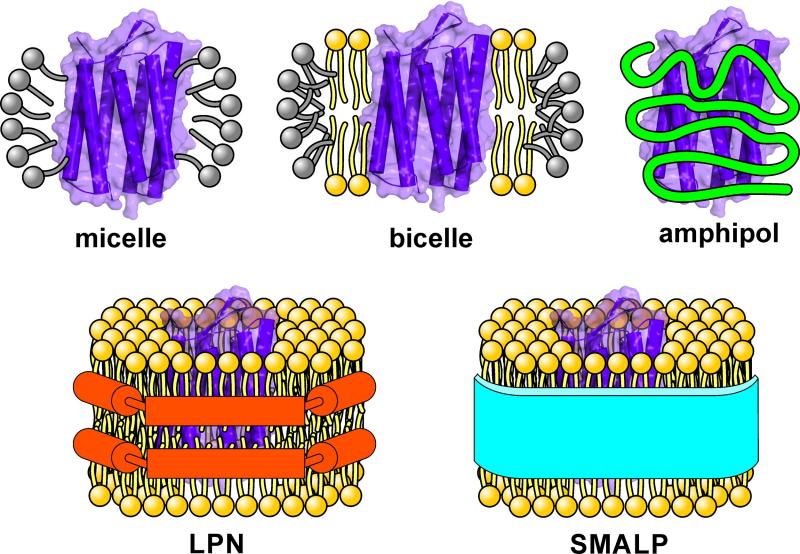 Все перечисленные среды в водном растворе могут образовывать частицы малого размера (радиусом от 2 до 6 нм), и каждая имеет свои преимущества и недостатки. Мицеллы - сферические частицы из молекул детергента, характеризуются самым малым размером, однако, меньше всего похожи на клеточную мембрану. Поверхность мицелл сильно изогнута, а детергенты взаимодействуют не только с внутримембранными частями белка, но и с теми участками, которые по идее должны находиться в водном растворе. Это приводит к потере активности белка, и, что самое неприятное, может поменять его пространственную укладку. Нанодиски - частицы, которые содержат участок липидной мембраны, окруженный поясом из специального белка MSP или полимера SMA (styrene maleic acid co-polymer). Среды на основе нанодисков очень близки по свойствам к мембранам клеток, но эти частицы имеют уже заметно больший размер (радиус от 4 нм). Бицеллы - дисковидные частицы, которые образуются в смесях липидов и детергентов, являются компромиссным вариантом, поскольку в теории содержат участок липидного бислоя. При этом размер частиц бицелл может варьироваться в широком диапазоне, начиная от 2.5 нм. Однако, до последнего времени было неясно, существует ли в действительности в бицеллах фрагмент мембраны.
