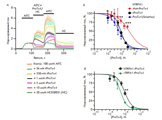 Далее активность полученного ProTx-I изучали с помощью ооцитов шпорцевой лягушки Xenopus laevis — модельных клеток, широко используемых для электрофизиологических исследований. Они позволяют понять состояние ионных каналов и рецепторов на мембране, которое легко заметить по изменениям проходящего через нее тока. В ооциты ввели гены, кодирующие каналы TRPA1 человека и крысы. Это хемочувствительный канал (отвечает на химические сигналы), который служит важной мишенью для таргетированной терапии болевых и неврологических воспалительных синдромов.