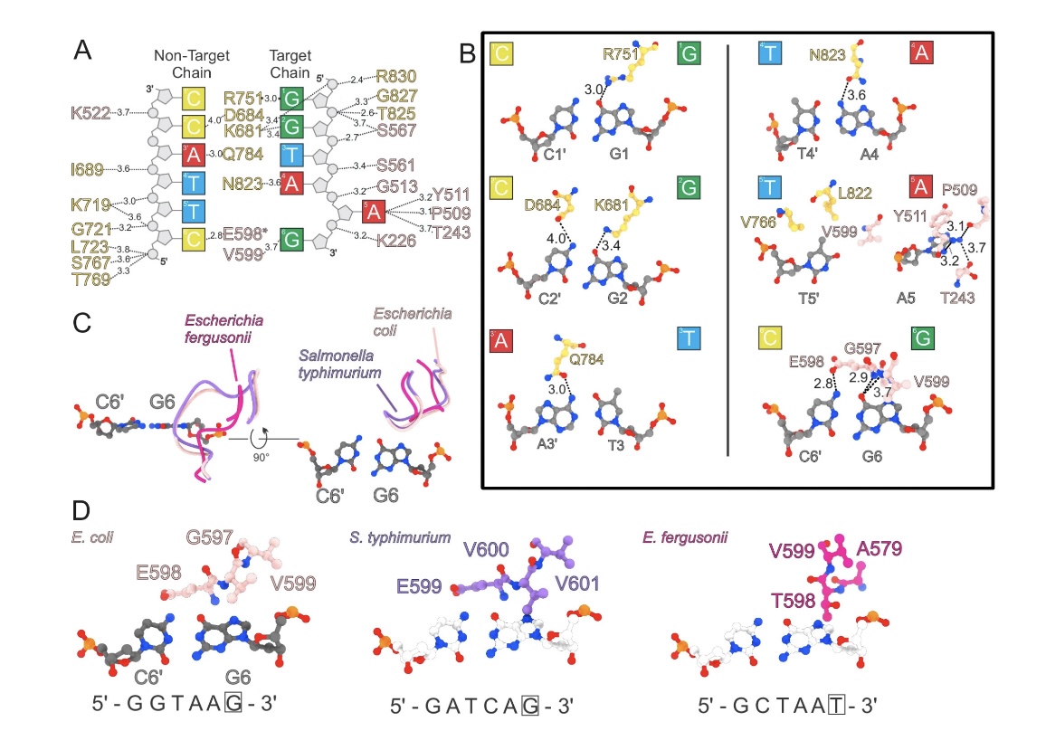 А. Схема взаимодействий между BrxX и сайтом BREX из шести пар оснований. Указаны расстояния в ангстремах. В. Молекулярная основа для сайт-специфического распознавания сайта BREX. Каждая пара оснований представлена отдельно и ориентирована с большой бороздкой сверху. Указаны расстояния в ангстремах. С. Видоспецифическая петля MTD распознает шестую пару оснований. Показана структурная суперпозиция петли 587–601 E. coli HS BrxX MTD (розовая) и эквивалентных петель в Salmonella typhimurium (фиолетовая) и Escherichia fergusonii (пурпурная). D. Параллельное сравнение вышеуказанных петель с аминокислотами. Источник: Drobiazko et al / NatureCommunications, 2025